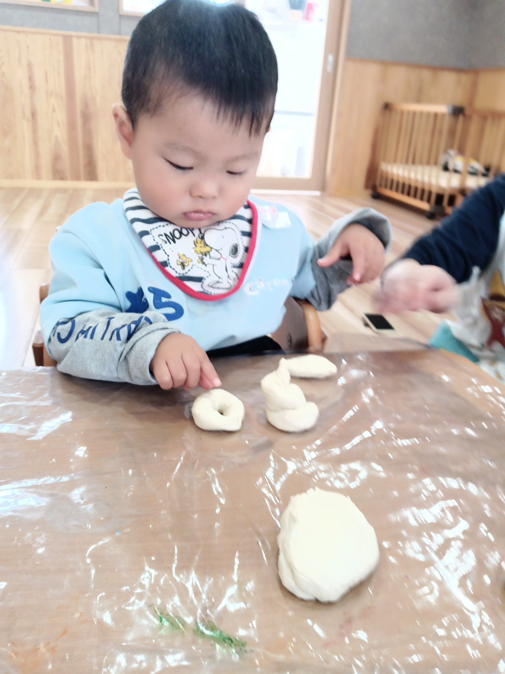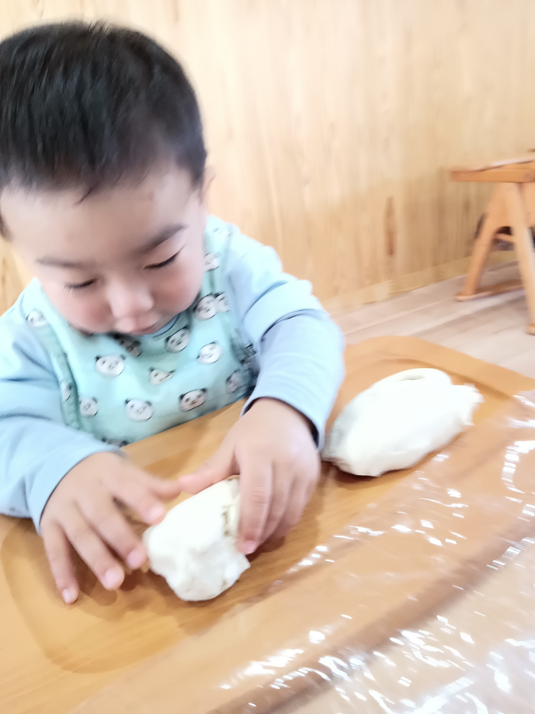 今日は、小麦粉粘土をしました🙂。初めて触る感触に恐る恐ると見たり指で触ったりと確認するひよこ組さん😊。感触になれると伸ばしたりちぎったりと楽しく遊んでいました☺️小麦粉粘度の後は園庭に行き、ボール⚾️遊びやシャボン玉🫧で遊んだり、芝生に寝転んだりと季節を感じながら思いっきりと外遊びを楽しむ事ができました☀️🐿りす組🐿