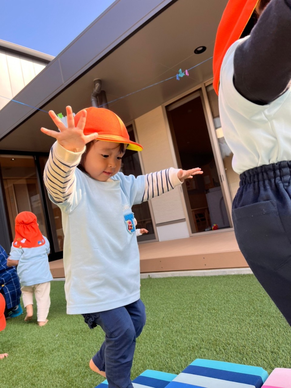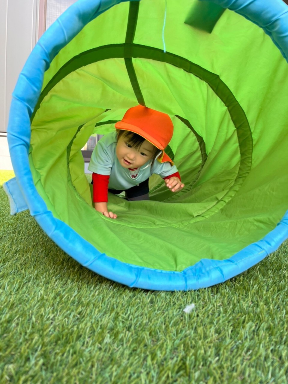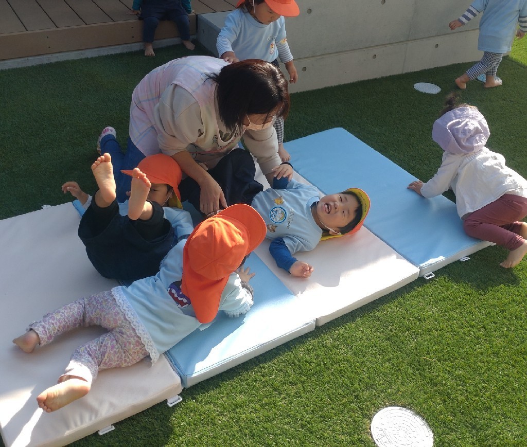 その後は、園庭でサーキット遊びをしました✨トンネル・階段・マットと方向と順番を守り楽しんでいました🥰猫じゃらしを見つけた子が保育者をくすぐり追いかけっこが始まり、他の子達も真似て笑顔で皆で走り回りました🎶