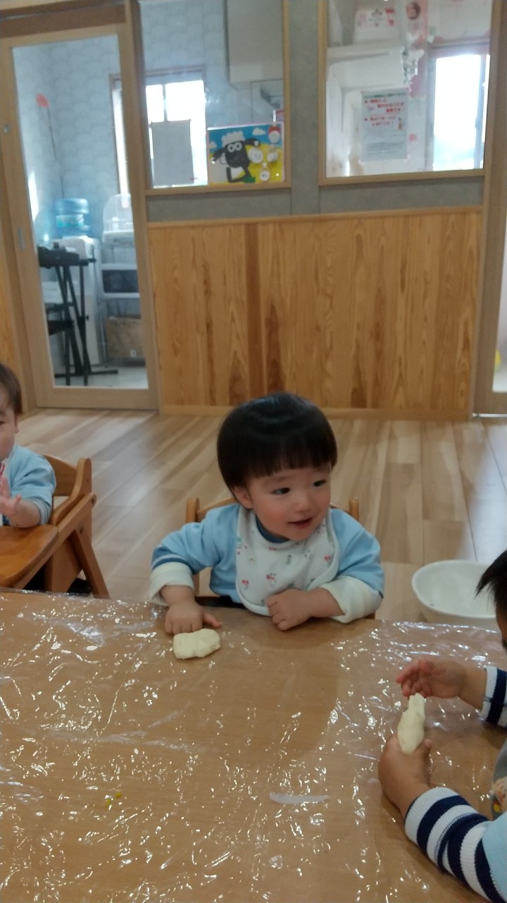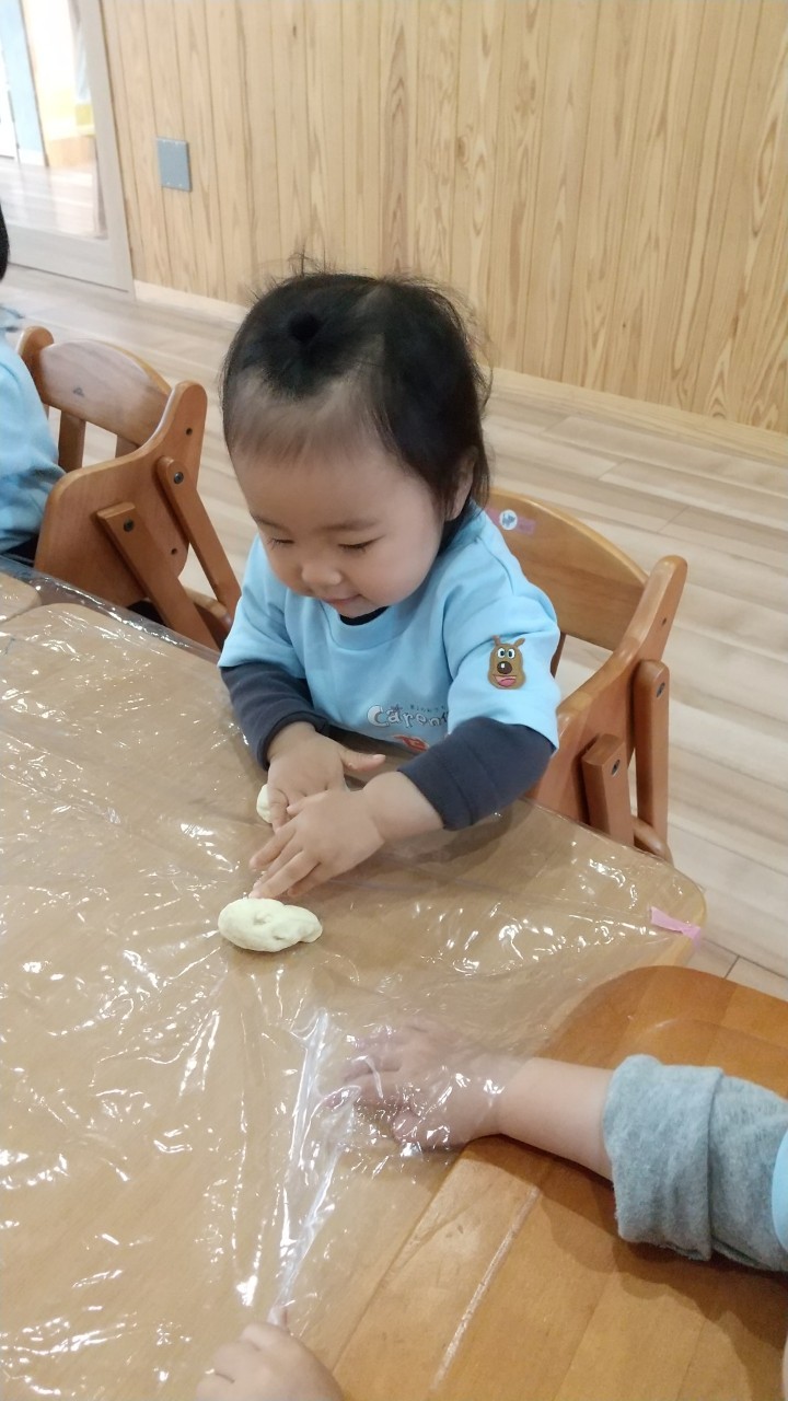 今日は小麦粉粘土遊びをしました。こねこね〜コロコロしたり、ちぎったりして感触を楽しんで、集中して遊びました😆