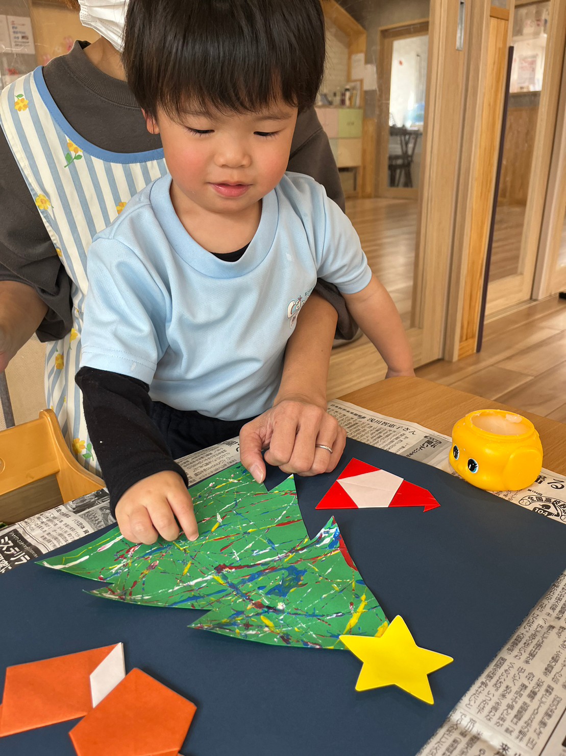 前回作ったクリスマスツリーに星を糊付けし、台紙に貼り付けました✨製作好きなお友だちが多いので、積極的取り組んでいました✌️糊の感触も経験を積み慣れてきましたよ🎶
