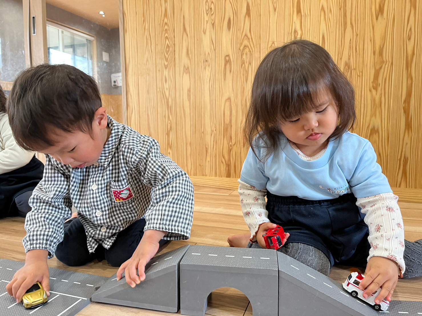 順番を待っている間はトミカのサーキット遊びをしました🚗友だちと一緒に道路に車を走らせたり、駐車場に並べたりと楽しんでいました☺️その後はお兄ちゃんお姉ちゃん達が飾り付けしたクリスマスツリーを見に行き、興味津々なりす組さんでした🎄ぱんだ🐼ぐみ