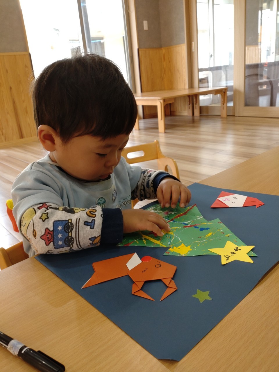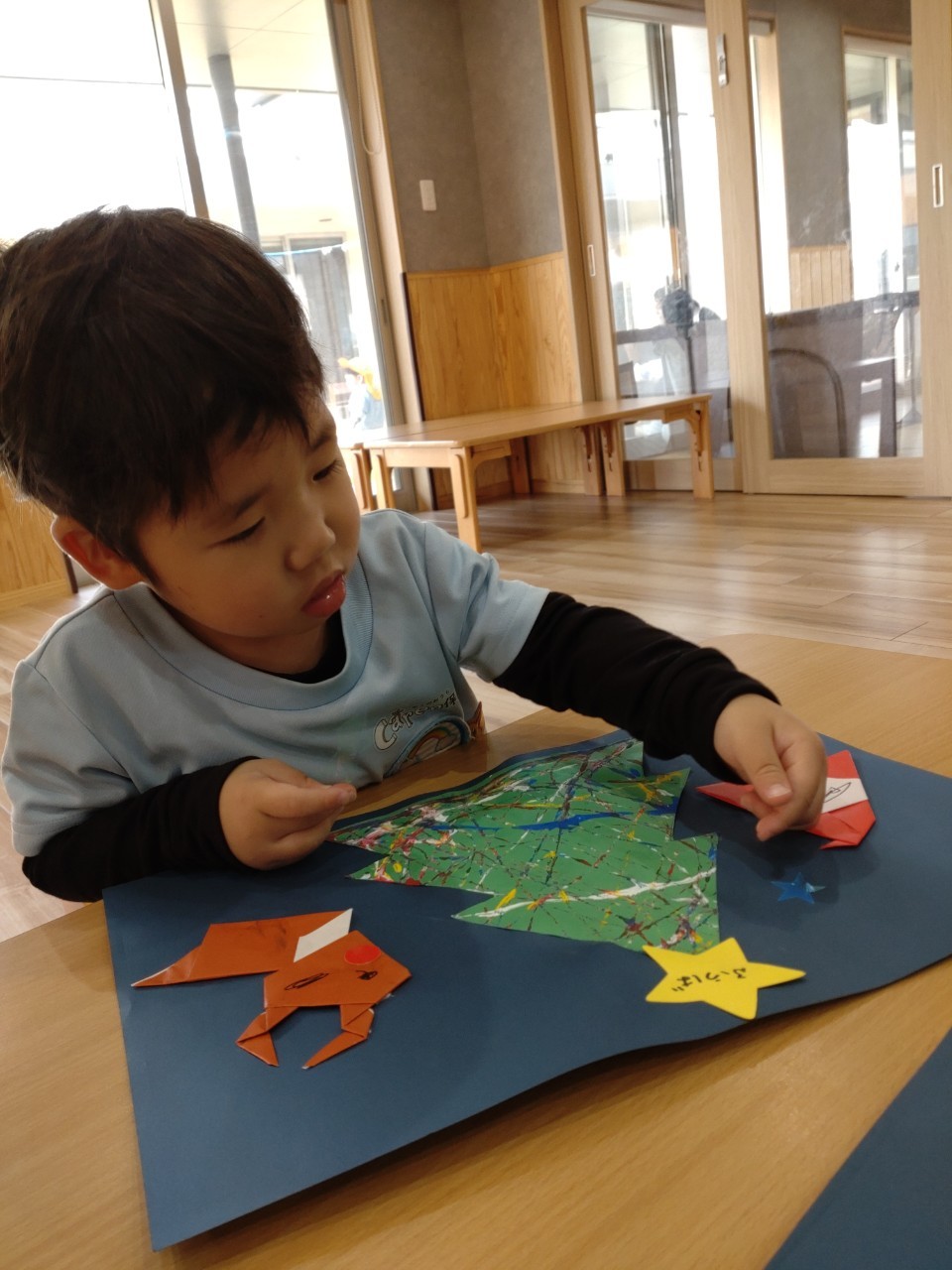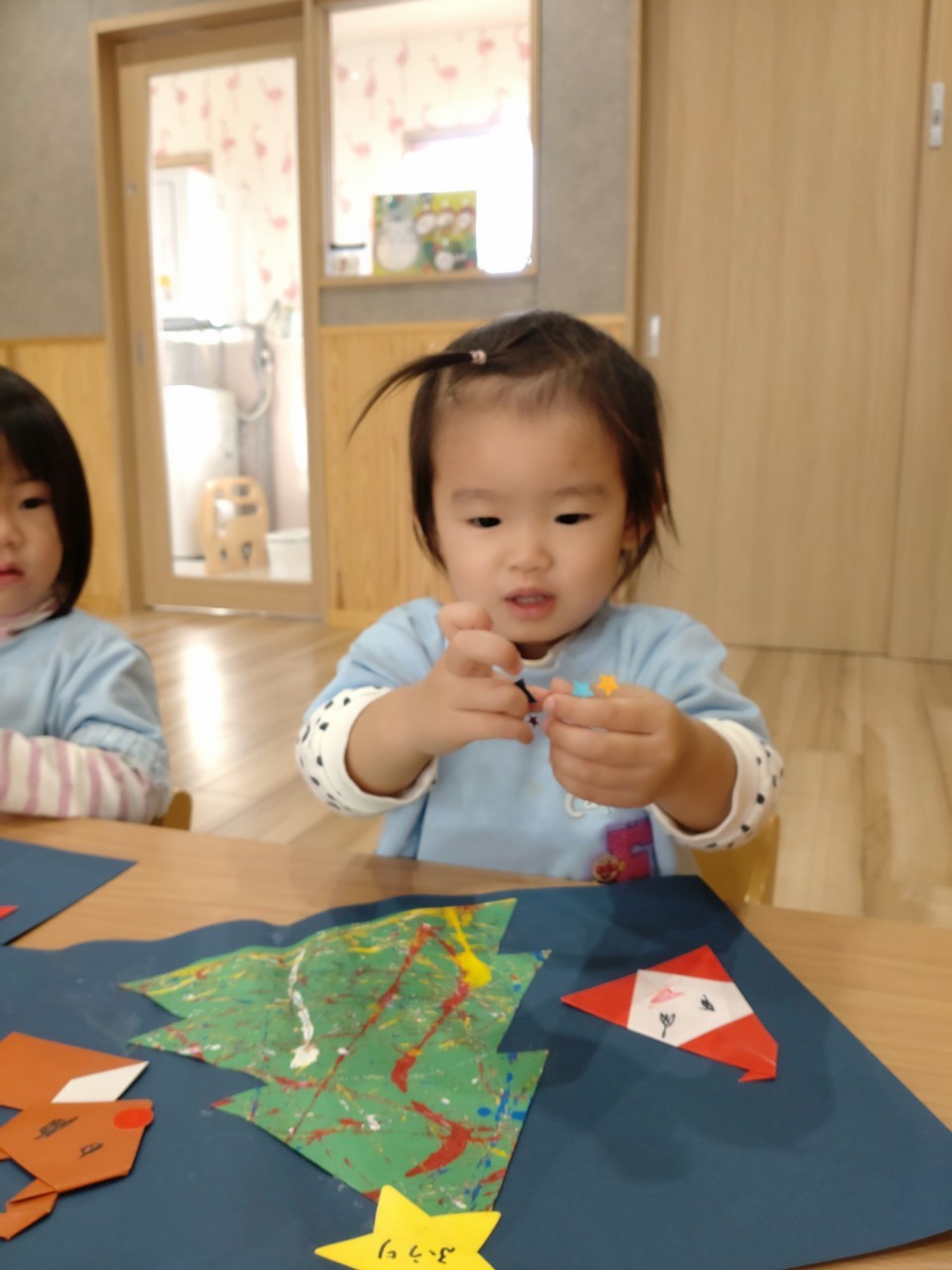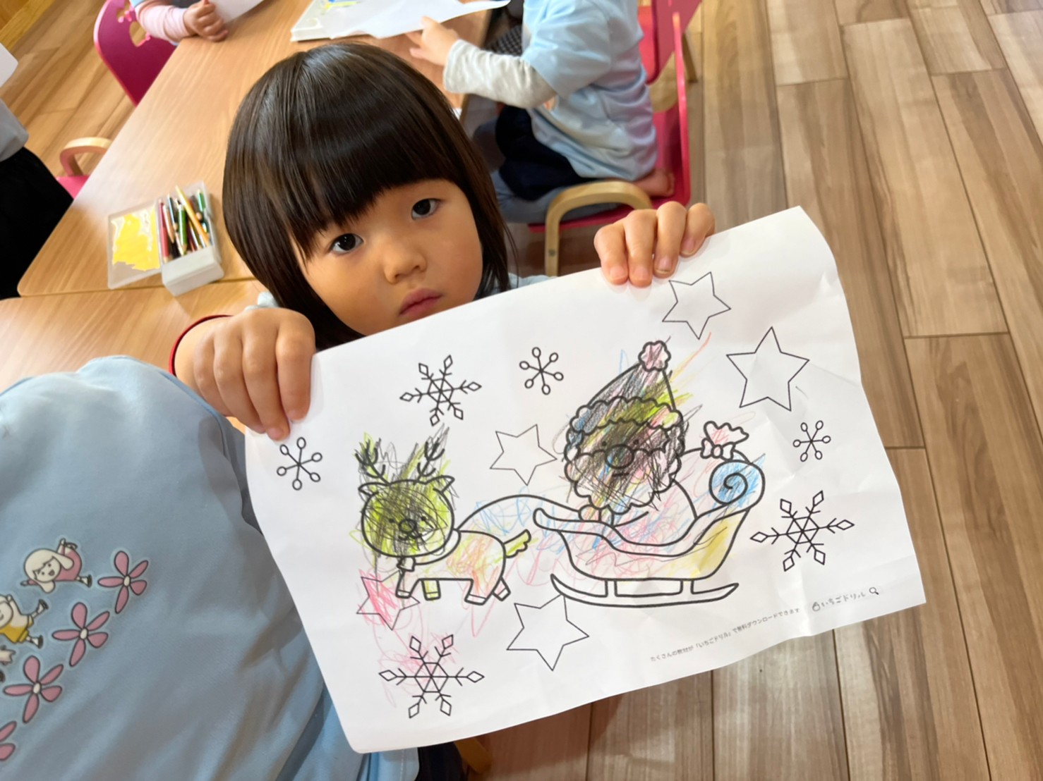 園庭で遊んでいる間に、お部屋では少人数でクリスマス製作を仕上げました🎄トナカイやサンタクロースの顔に「め〜❣️」「くち〜❣️」と言いながら、ペンでパーツを描きました☺️最後に夜空に星のシールを貼って素敵な作品ができました✌️ぱんだ組🐼
