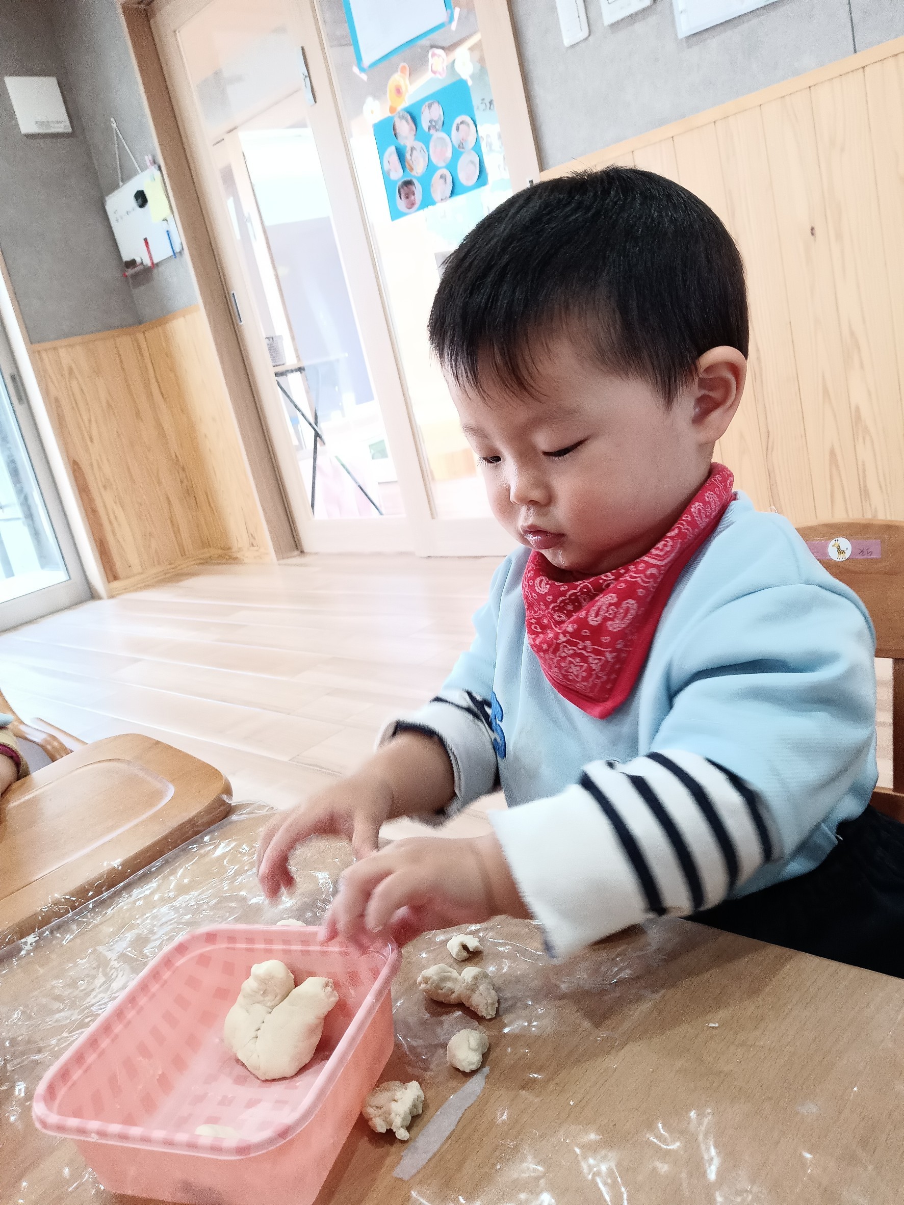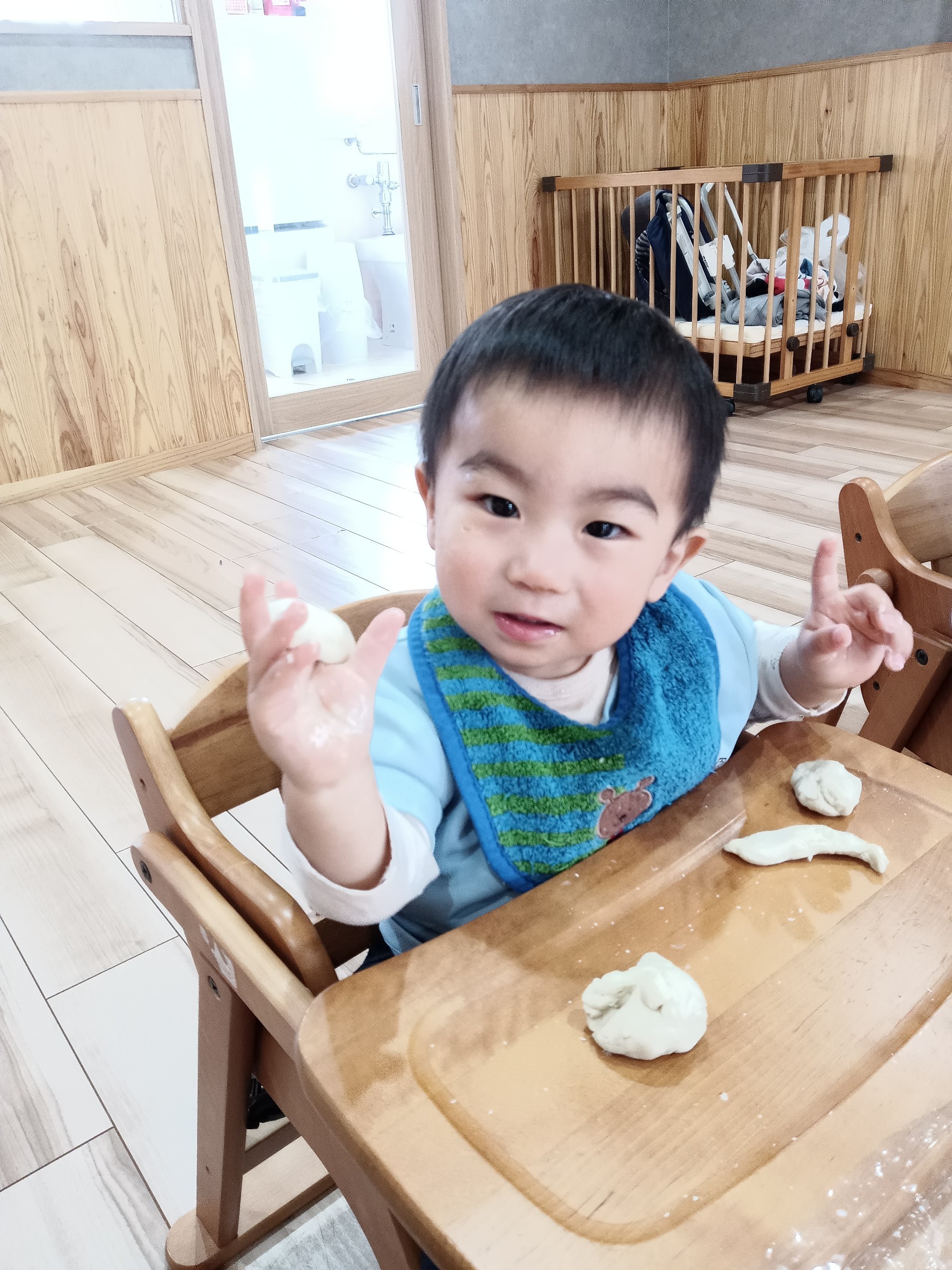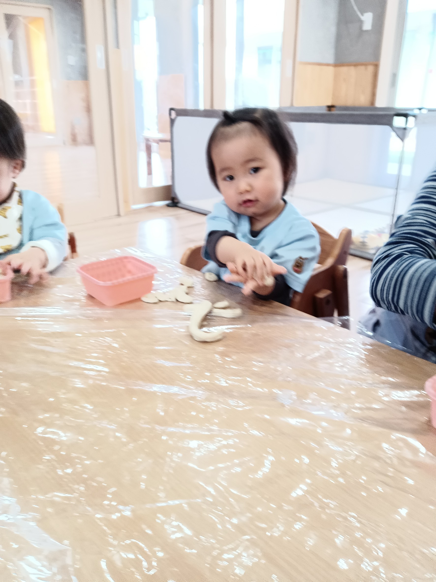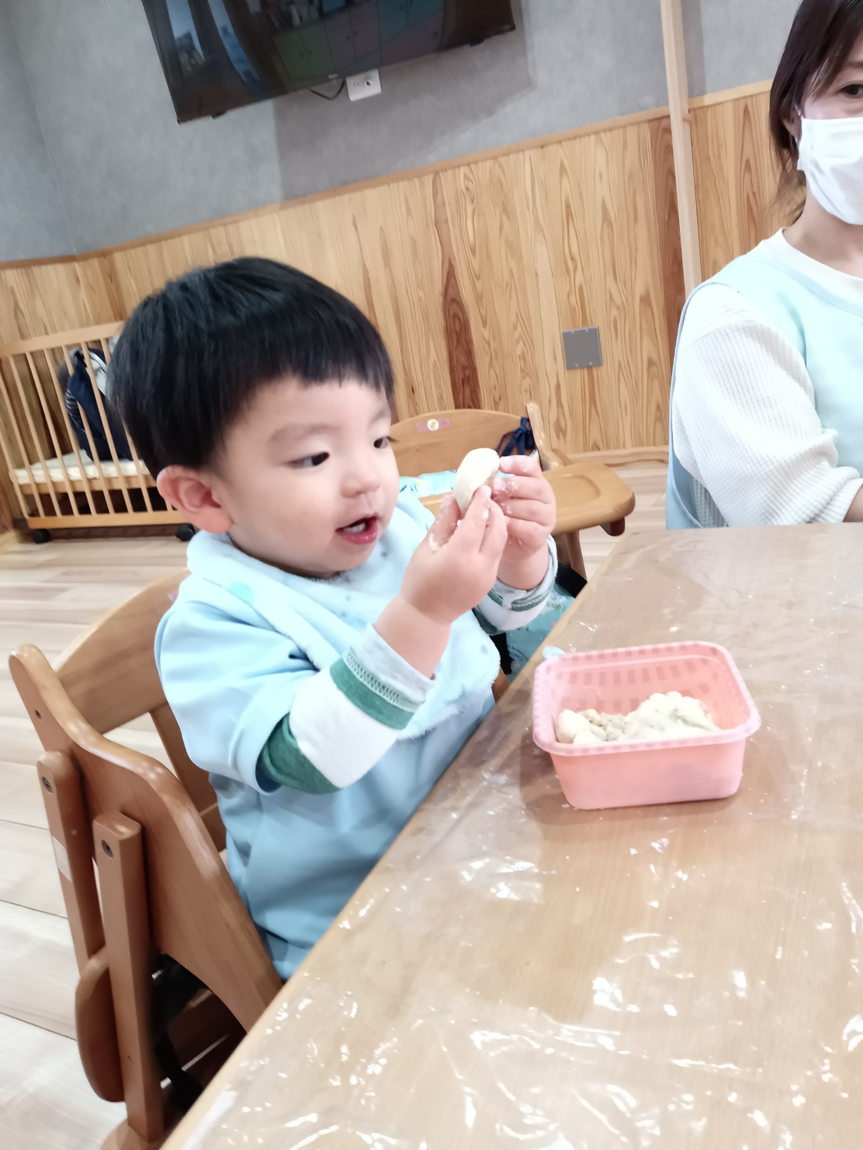 ひよこ組(ひよこ)今日は小麦粉粘土で遊びました☺️。一人一人に容器を準備し、ちぎってみたり、コネコネしてみたり、潰してみたりといろいろな遊び方をする姿が見られました✨保育者に食べ物を作ってもらうと食べる真似をしたり、どうぞ!と渡したりと集中して遊んでいました☺️