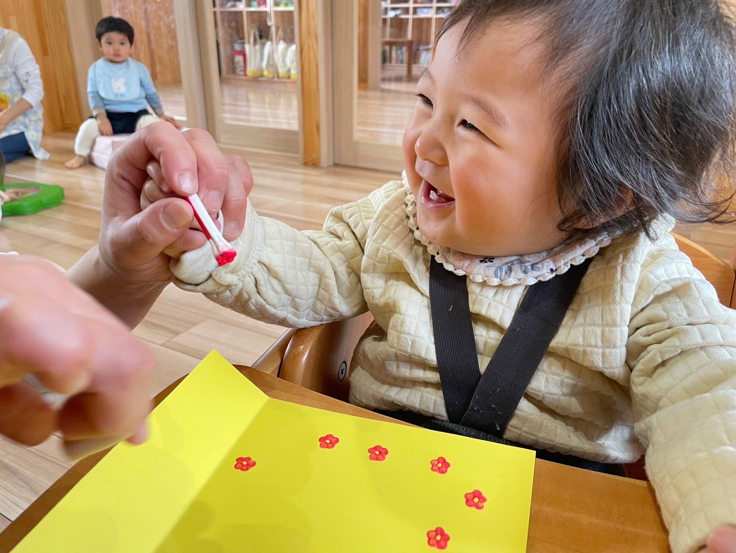 黄色の画用紙に広がるお花を眺めて嬉しそうでしたよ😆