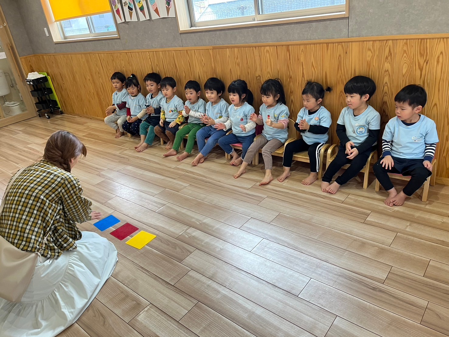 リトミックの前にリズム遊びで「落ちた落ちた」をしました🎶「りんご」と言ったら手をお皿にしたり「かみなり」言ったらおへそを隠したりと簡単なポーズをとって盛り上がりました😆