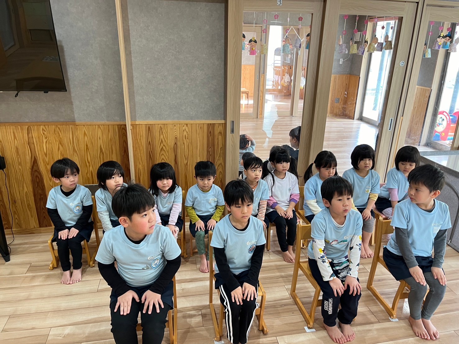 その後、部屋を移動し卒園式の練習をしました!初めてでしたが、緊張感を持って姿勢を正したり、立ったり座ったり。きりん組さんはドキドキしながらも入場から証書受け渡し、退場までを通して練習することが出来ましたよ👏