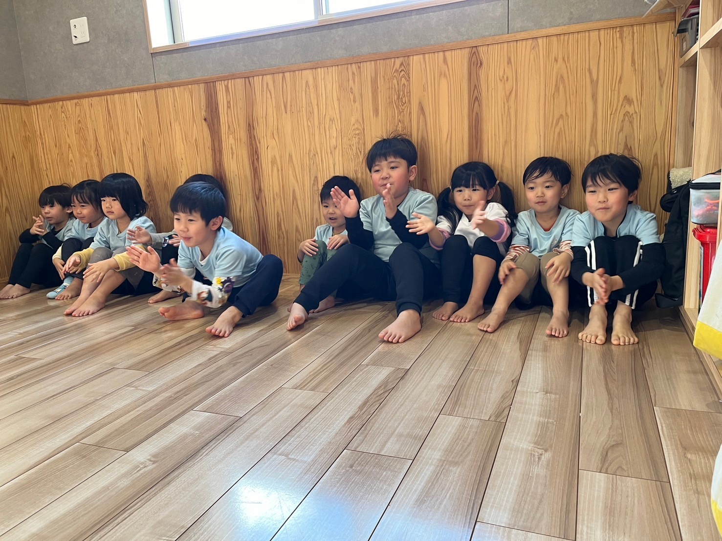 「あたま、かた、ひざぽん」の歌に合わせてリズム打ちをし、ぽんの数が増える度に子どもたちは大盛り上がりで、一生懸命合わせてみようとしていました🎶