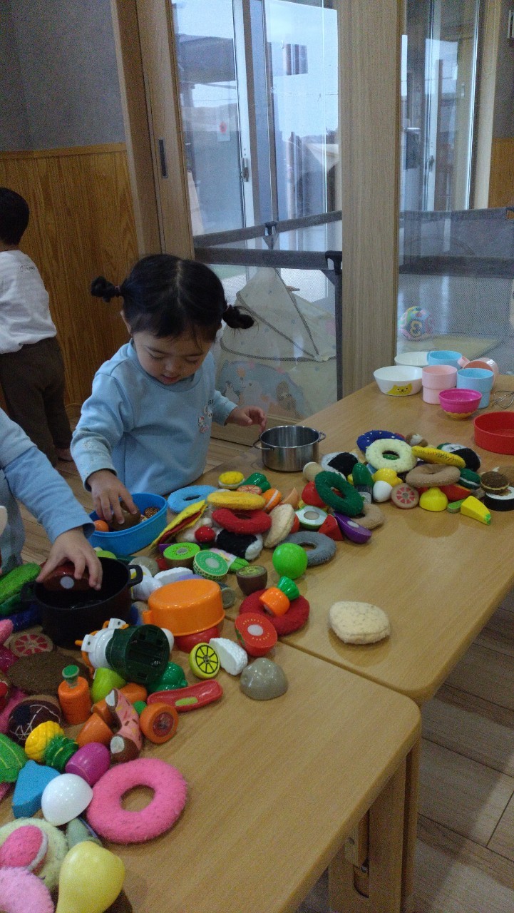 ままごとのお友だちはクッキングを張り切っていて、沢山のご馳走を作ってニコニコでした✨大型キッチンで野菜をどんどん洗っている様子がかわいかったですよ😄💕ぱんだぐみ🐼