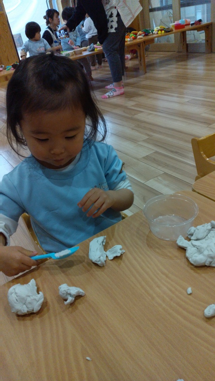 今日はお部屋でコーナー遊びをしました。はじめにままごとと粘土遊びのコーナーをよ〜く見てから自分で好きな遊びを選んでスタートしました😄粘土のお友だちはアンパンマンやお化け👻、ドーナツ、アイスなど自分なりのイメージで作っていましたよ。一緒に遊びながらの先生との会話も弾んでいました😆💕