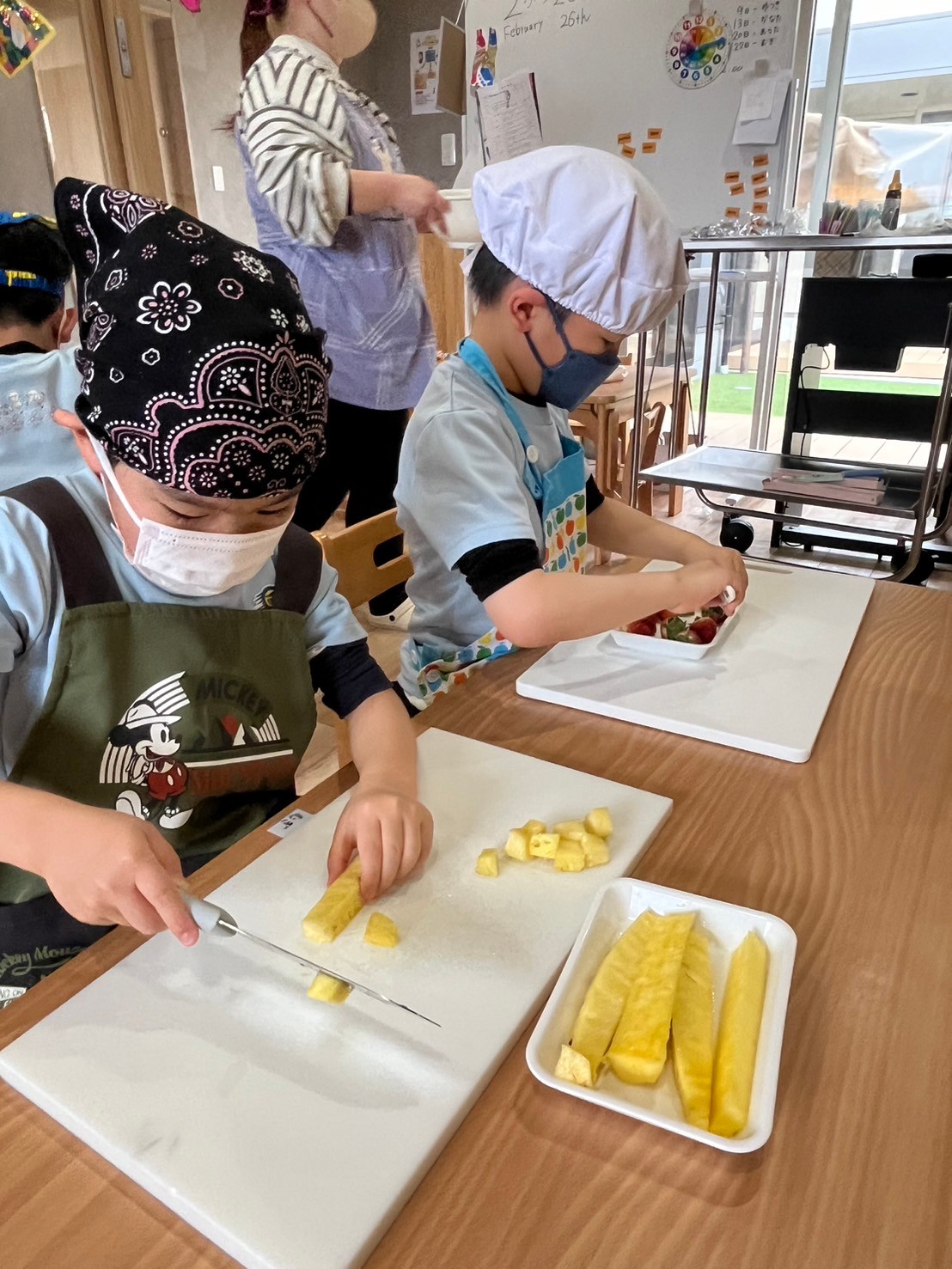 自分たちでフルーツをカットし、盛り付け、オリジナルのフルーツパフェができましたよ(パフェ)