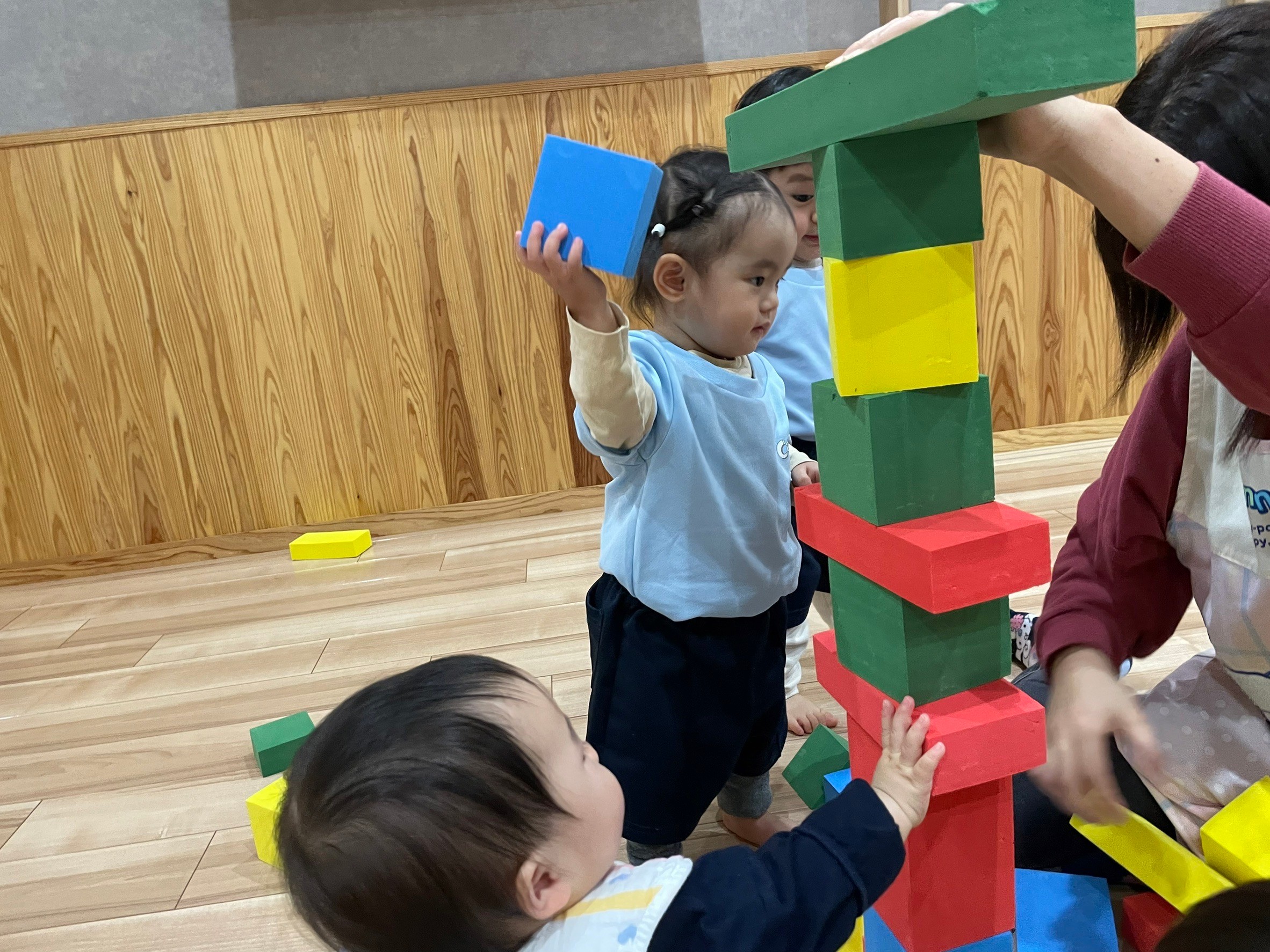 先生が大型の積み木を高く積み上げると、お友だちが集まってきて勢いよく崩しては楽しそうに笑っていましたよ😄自分で積み上げる姿も見られ、成長を感じました🥹