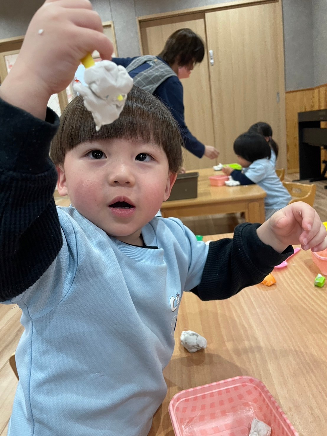 今日は粘土遊びをしました!好きな形にちぎったり丸めたりこねたりしてすごい集中力でした☺️先生がアンパンマンを作ると大喜びでさわったり、型抜きを頑張ったりとそれぞれ自由に楽しんでましたよ!その後は避難訓練で不審者の想定で奥の部屋に逃げる練習をしました💦「パンダ組に行きますよ」と声をかけると、静かに落ち着いて避難することができました👏毎月の避難訓練の成果が発揮でき速やかに移動しています✌️ぱんだぐみ🐼