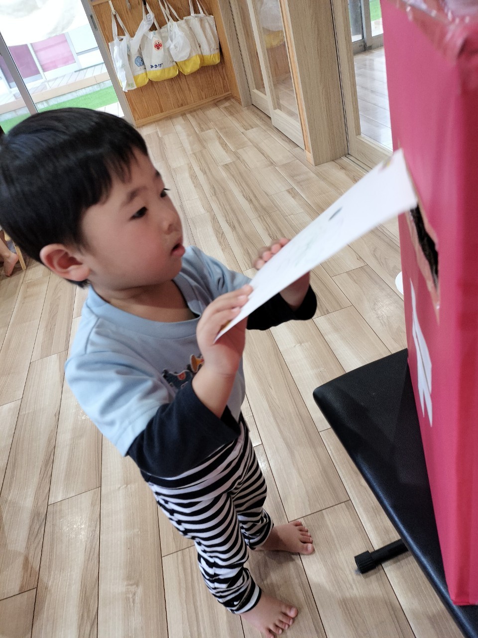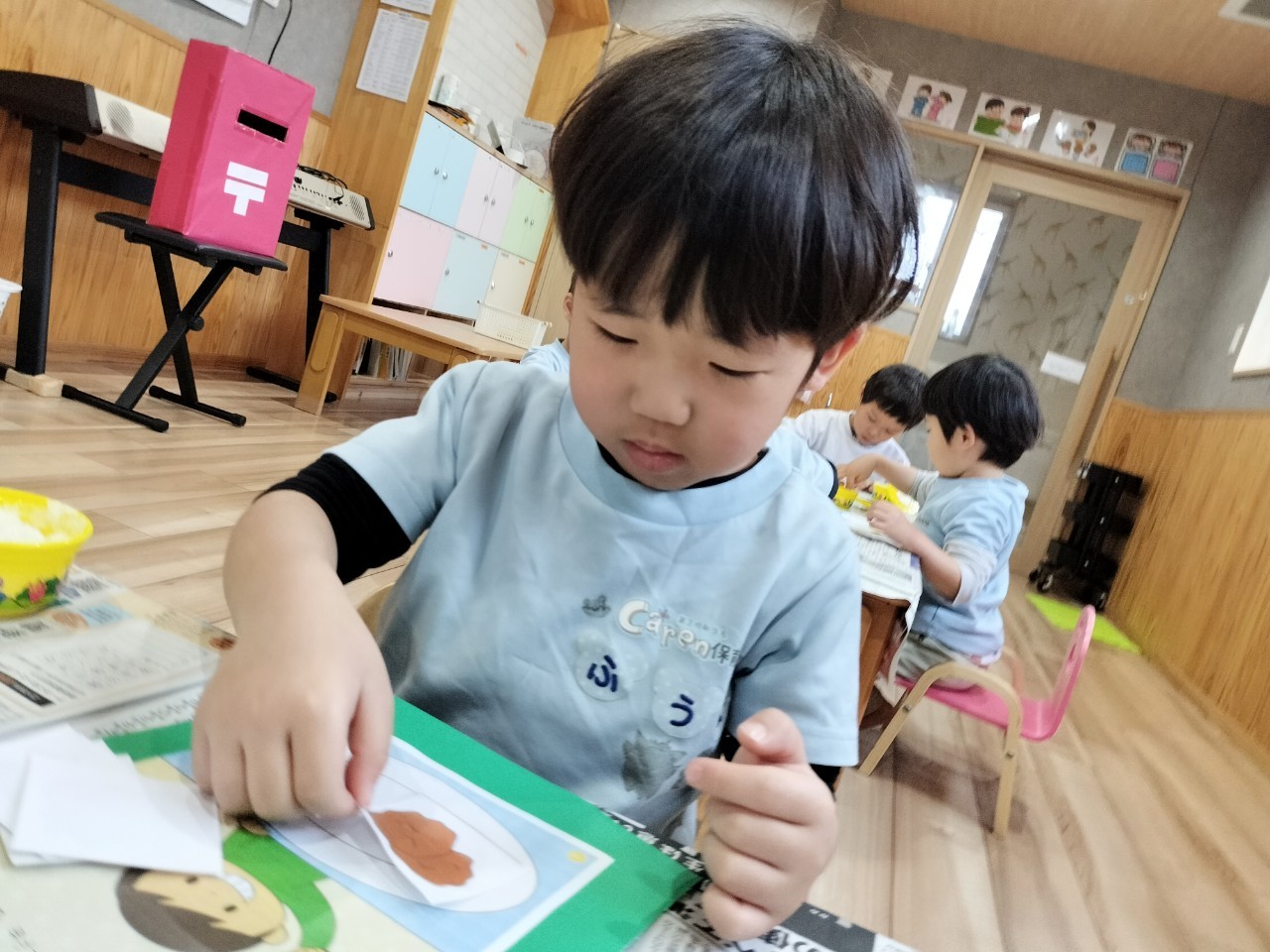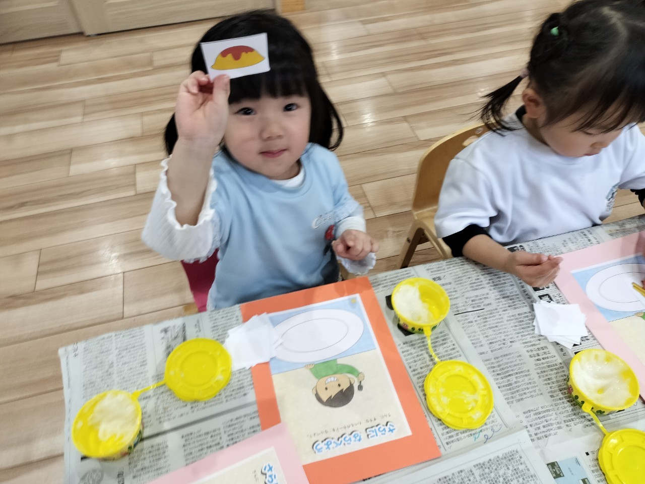 英語教室の後は以上児さんにカラーペンでお手紙をかいたりシールを貼り、手作りポスト📮に投函しました♥ その後は糊製作で御飯作りをし、いろんな具材をお皿に貼り美味しそうな御飯ができました😊うさぎ、こあら、きりん