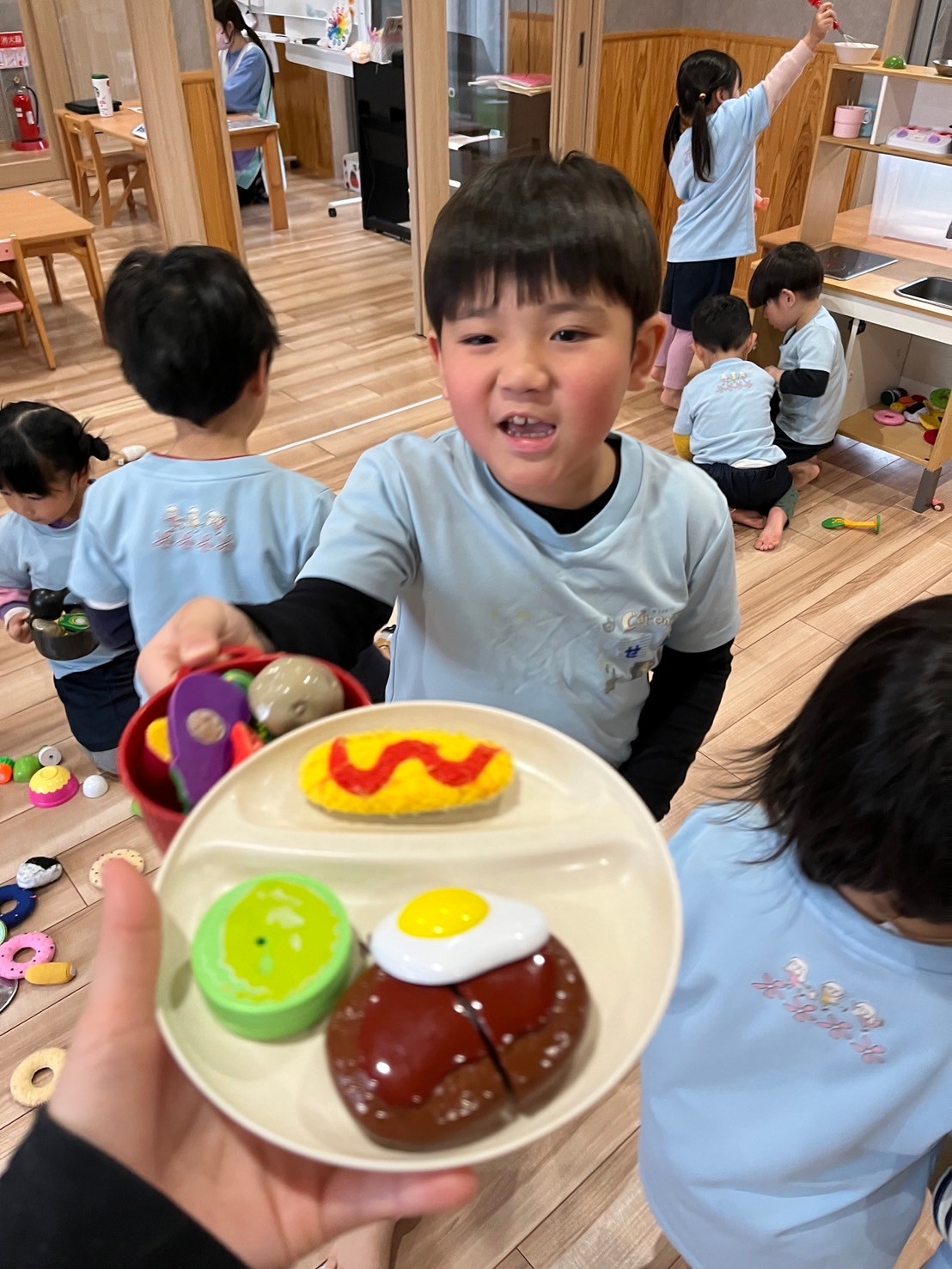 ままごとでは、お店屋さんになったりキャンプを始めたり、遊び方の幅の広さに保育者も楽しく参加していました🤣🩷【くりえいと園の今日の給食です】