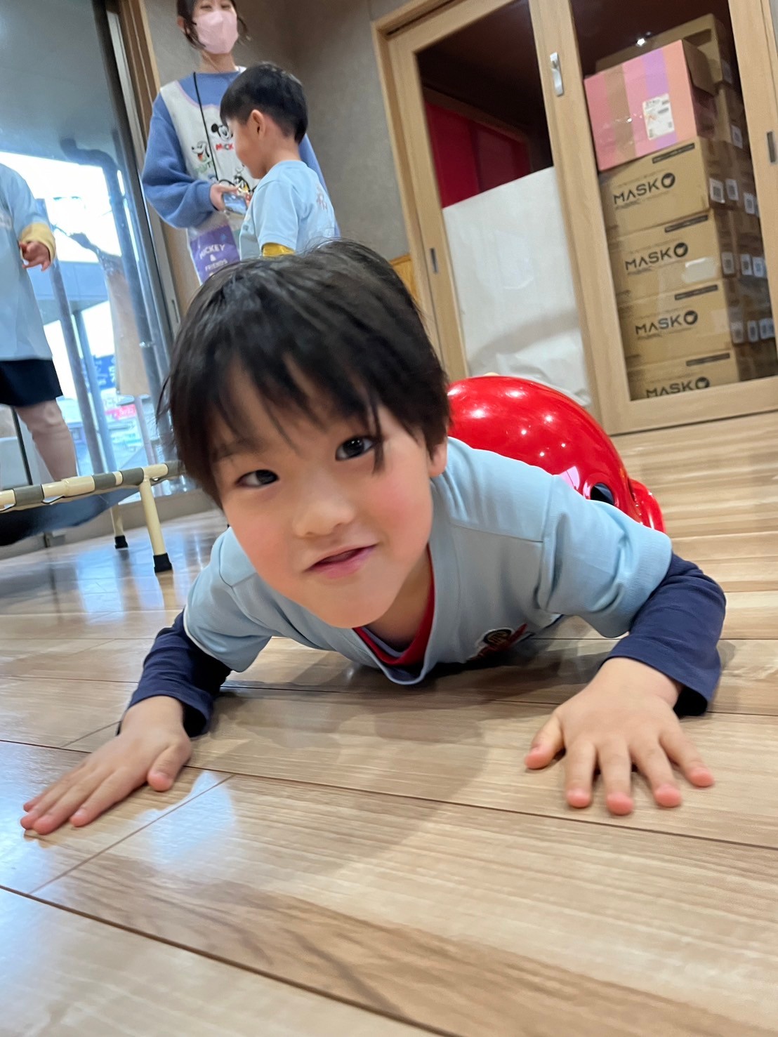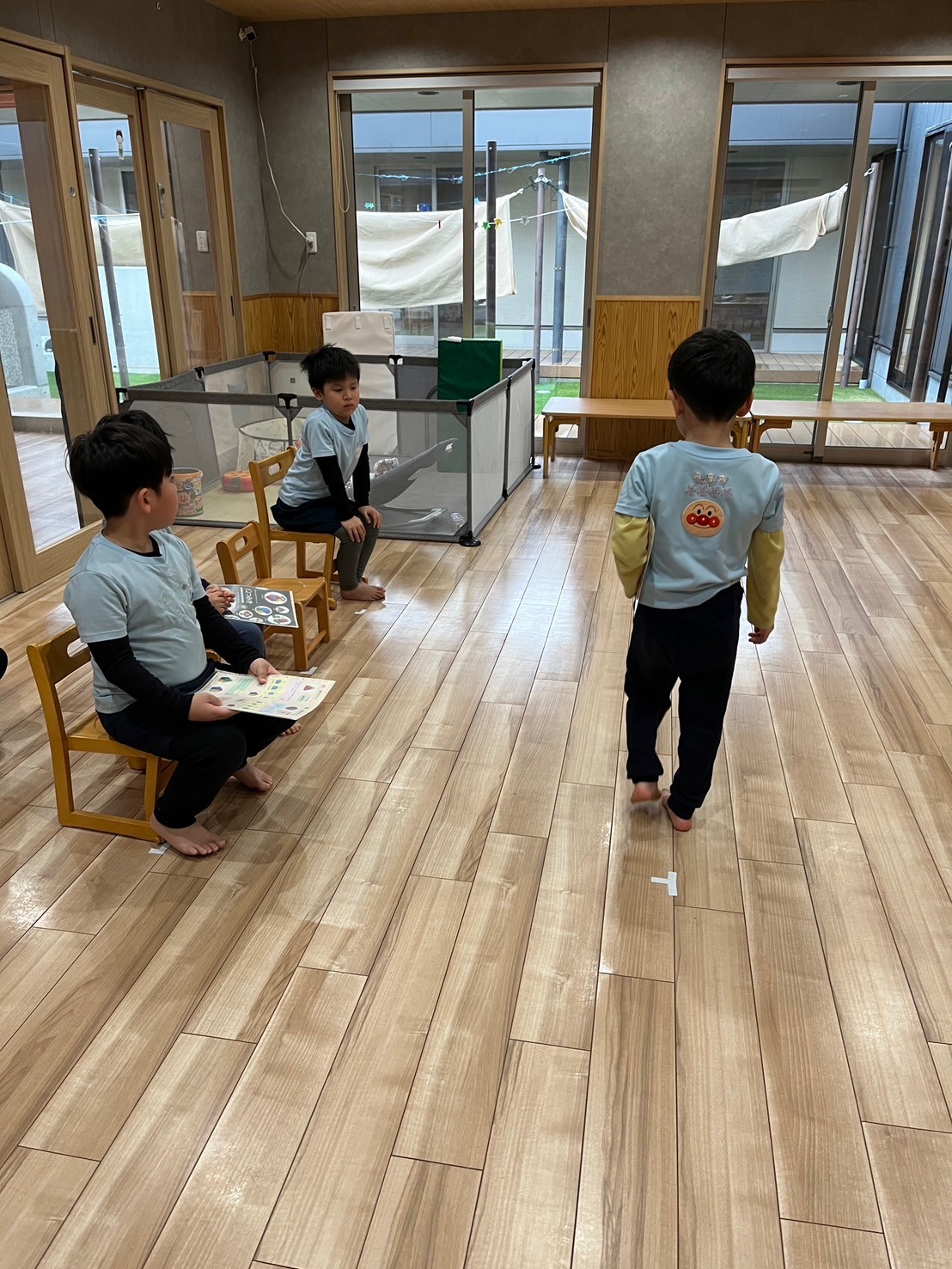 いつもの保育室ではなく、以上児さんのお部屋の隣だったので、ちょっと緊張気味のひよこさんでしたが、元気いっぱい身体を動かして楽しんでいましたよ😆