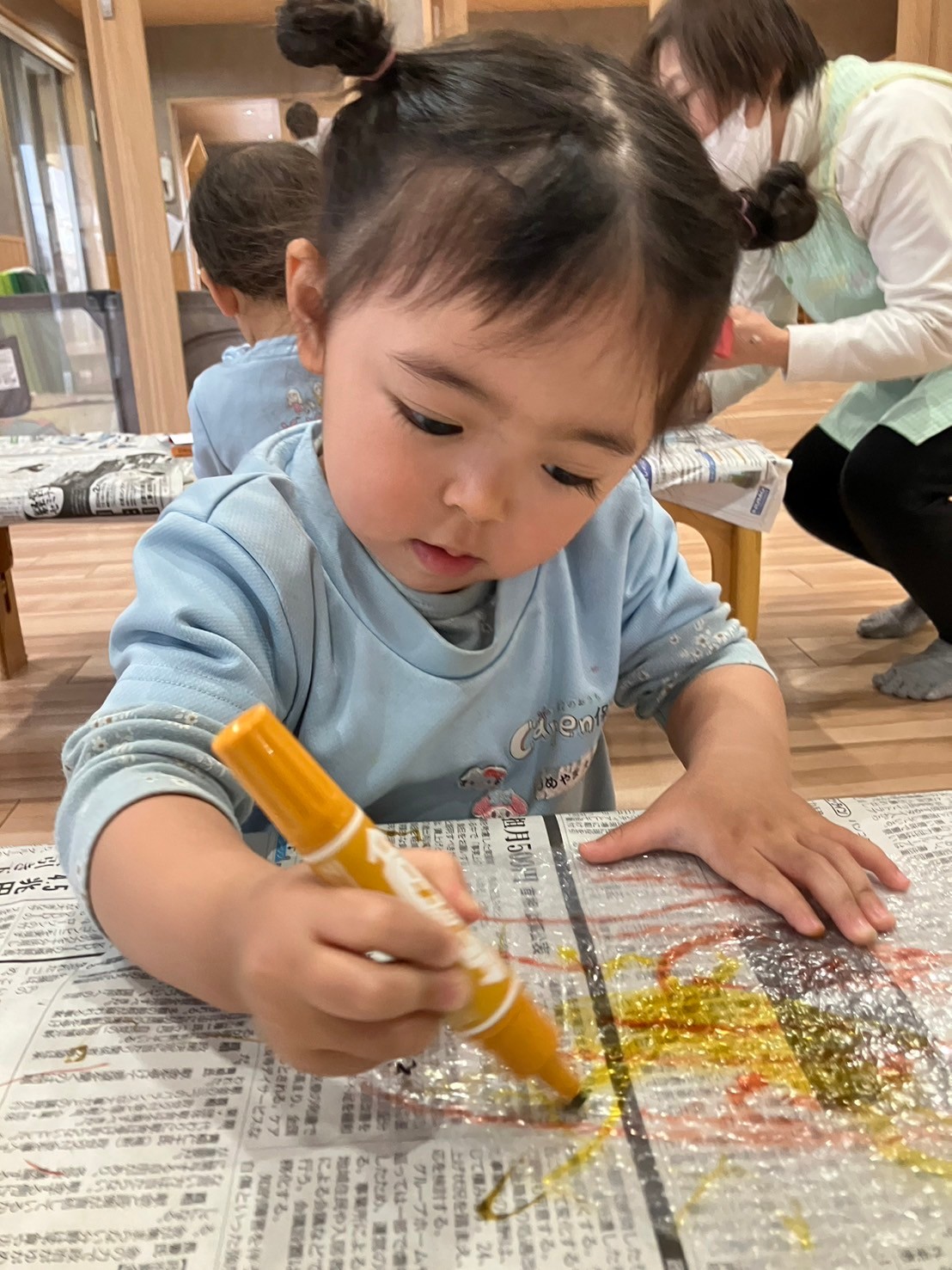 今日は月の製作をしましたよ🥰蜂の巣に見立て緩衝材のプチプチをペンで塗っていきましたよ🎶蜂の模様を描いたり春への期待も膨らみました💕