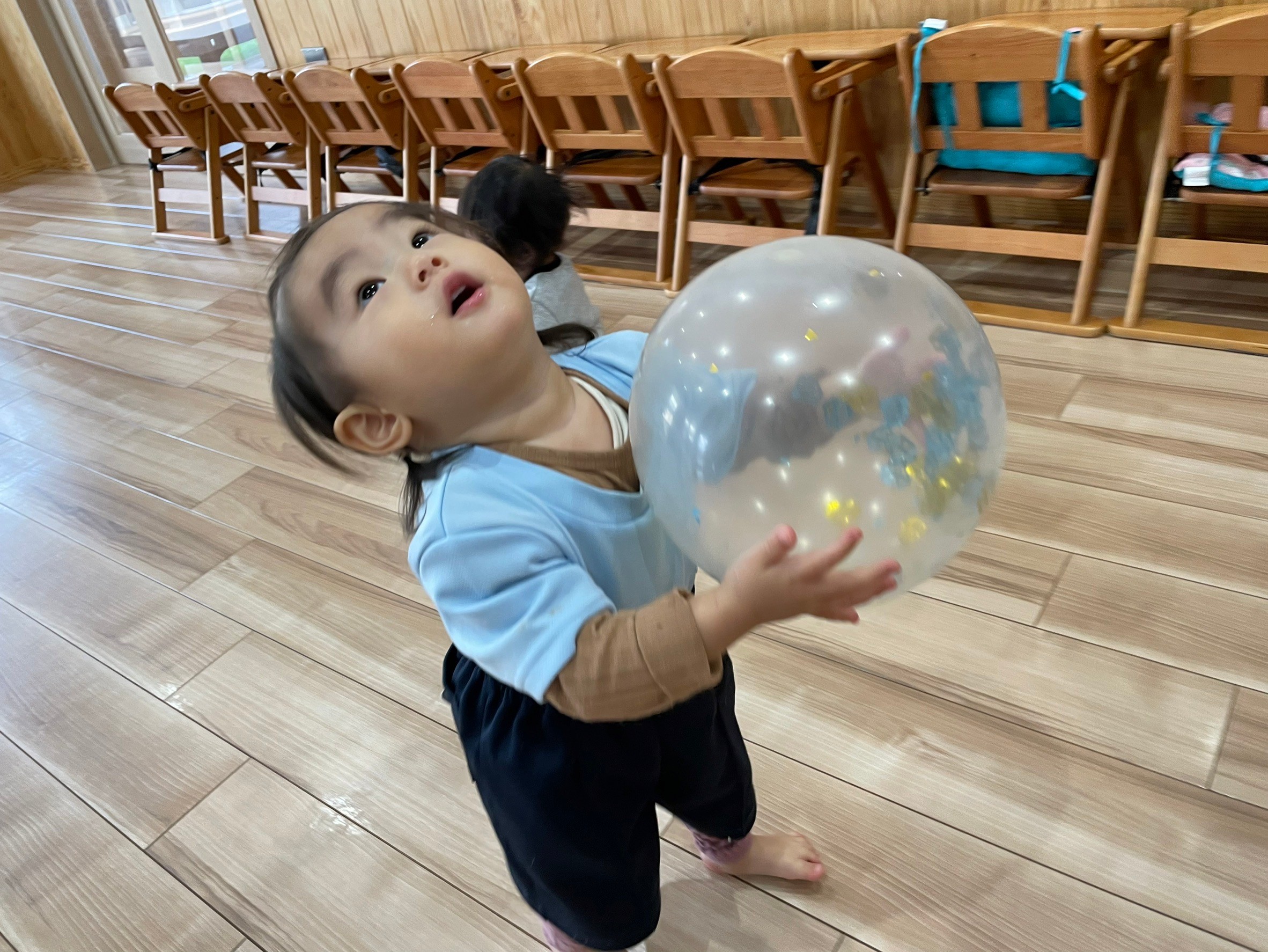 風船の中に入ってる色とりどりのハートに釘付けになり、大事そうに持ったり、振ってみたりと楽しんでいましたよ🥰