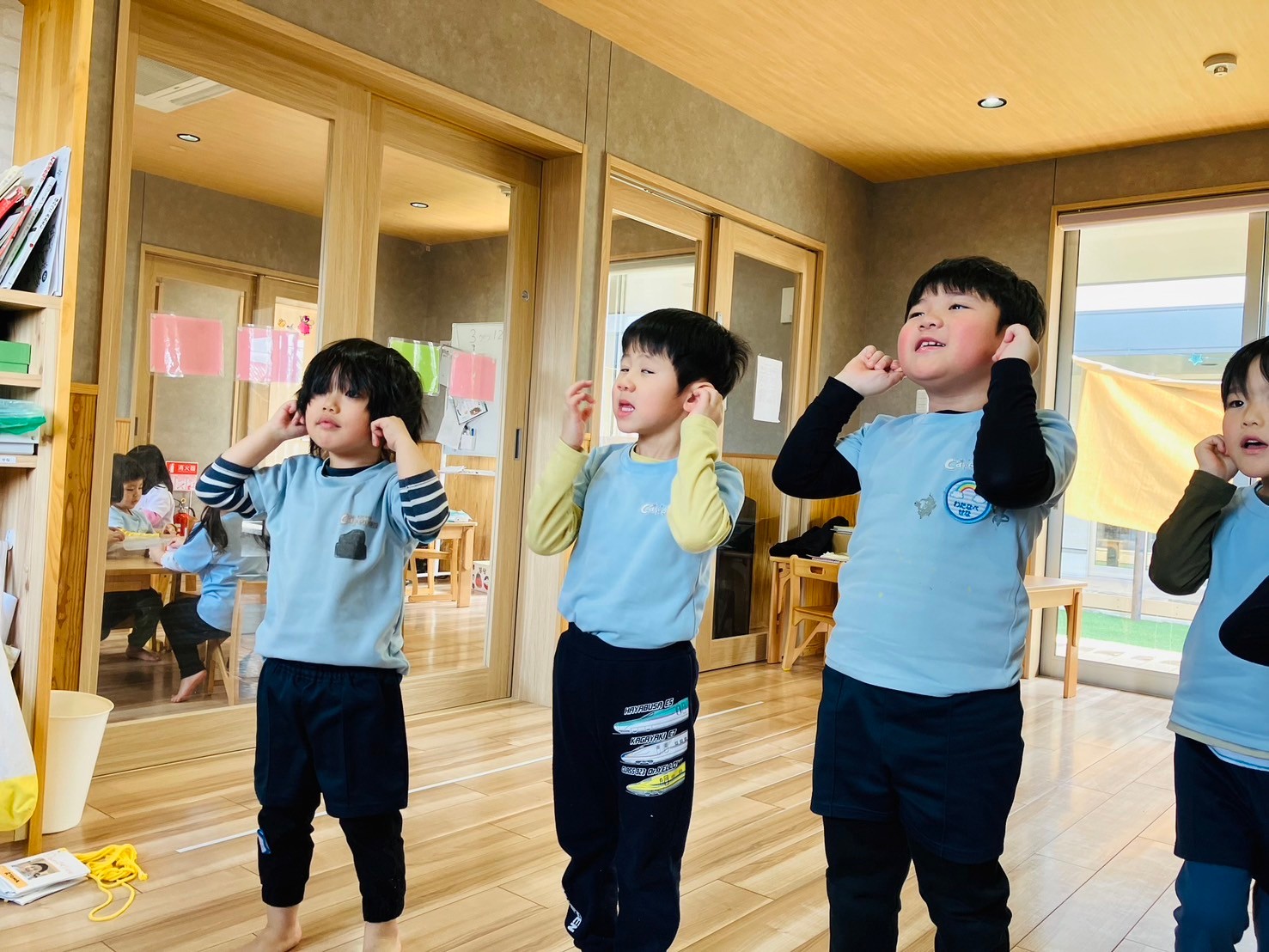 今日は英語教室で、歌に合わせて身体のパーツの英語を覚えました😊歌のテンポが速くなると「キャー😆」と言いながら、先生の真似をして身体を触っていましたよ✨