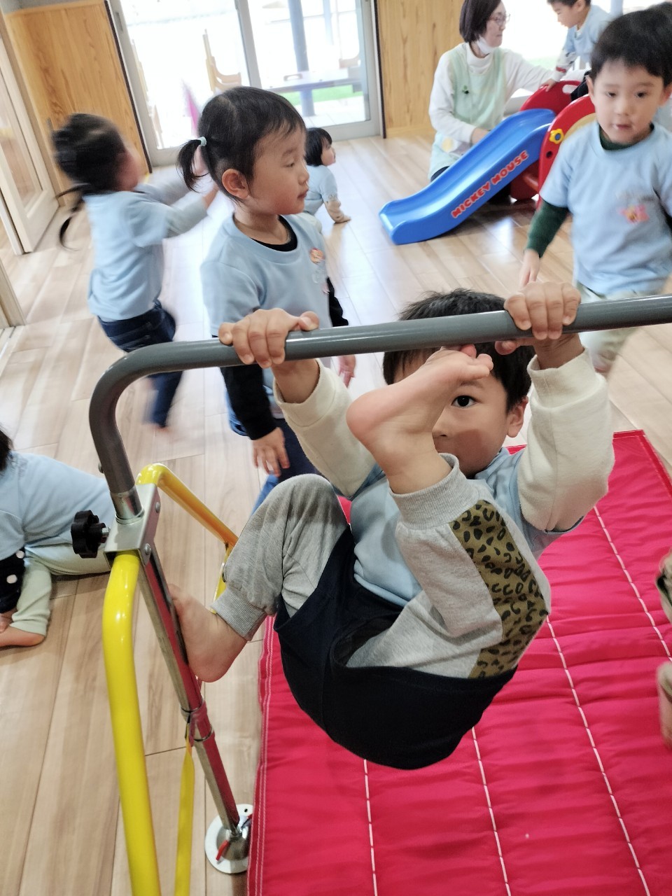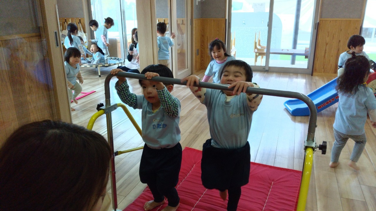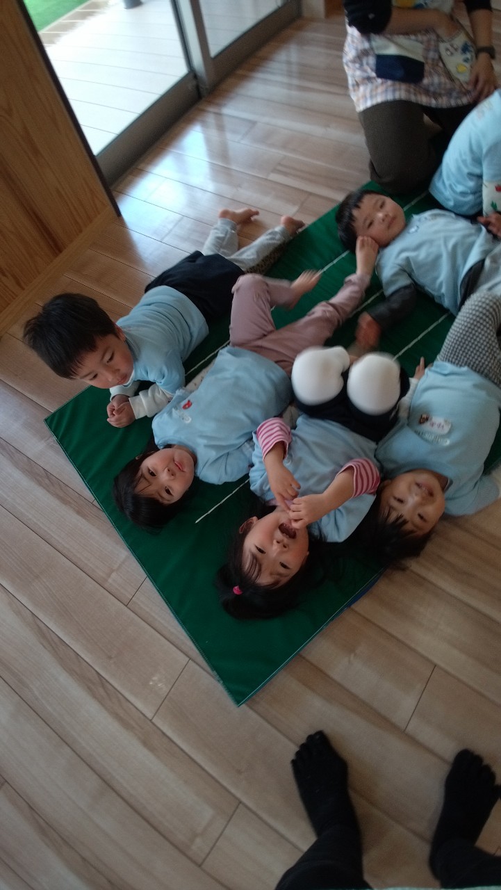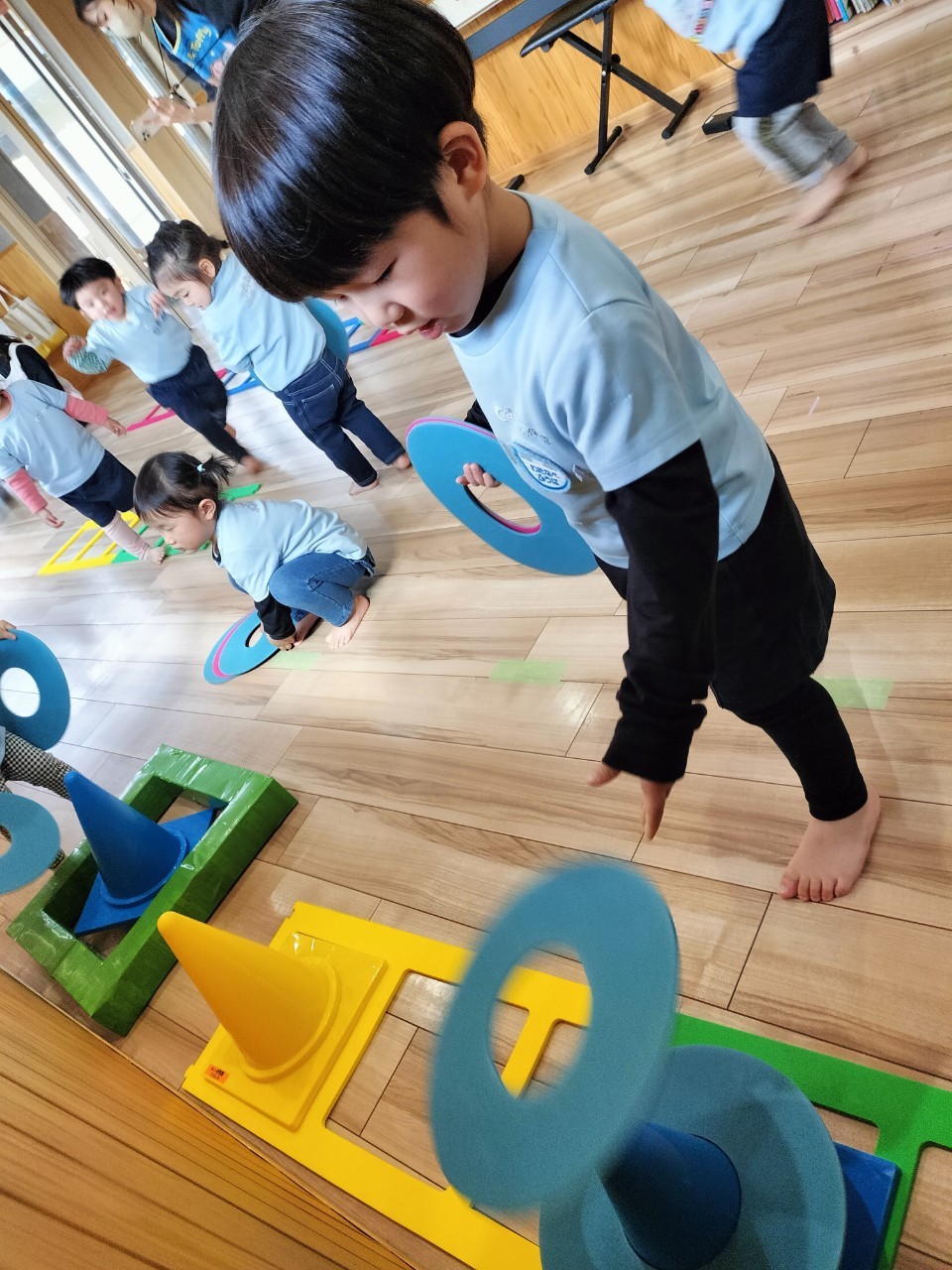 英語教室の後はりす組さんと一緒に部屋をオープンにしてサーキットで遊びました。トランポリンや輪投げ、滑り台、マット、鉄棒と盛りだくさんでした。鉄棒にぶら下がってみたり滑り台を滑ったり、コーンに輪っかを投げて輪投げ遊びをしたり、最後はりす組のお部屋でたくさん体操をして遊びました🛝。