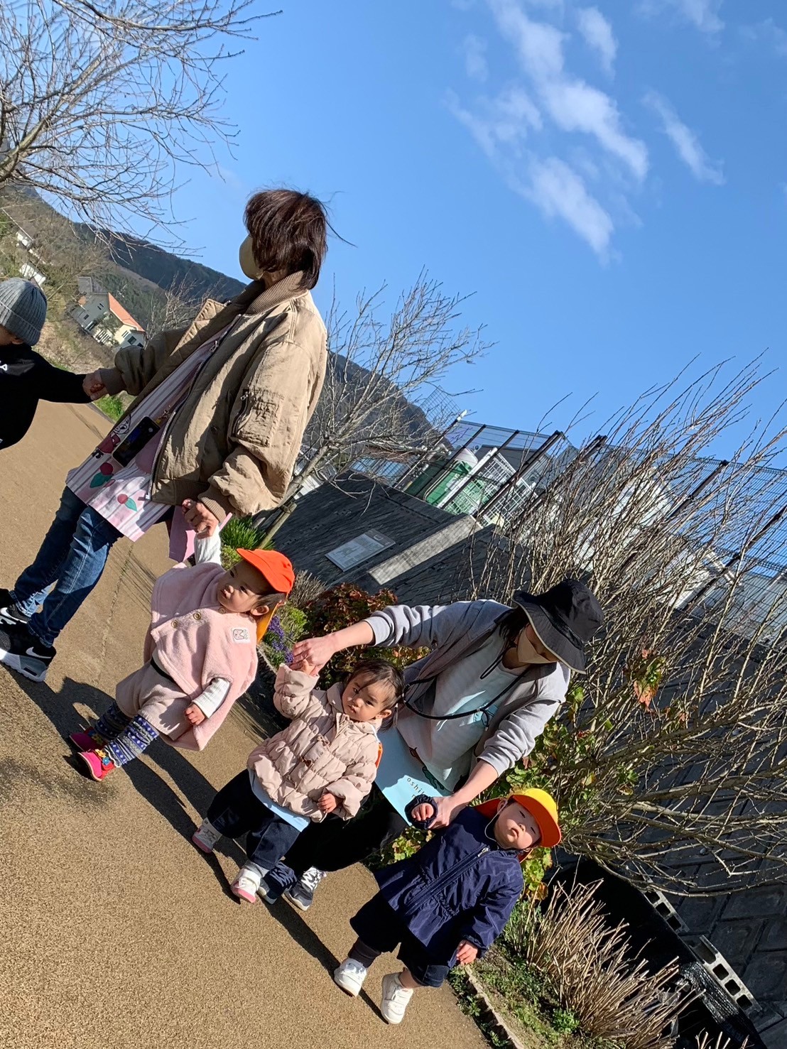 花壇のチューリップの1本から蕾が顔を出しているのを見つけみんなで観察しながら春を感じました🌷りす🐿️ぐみ