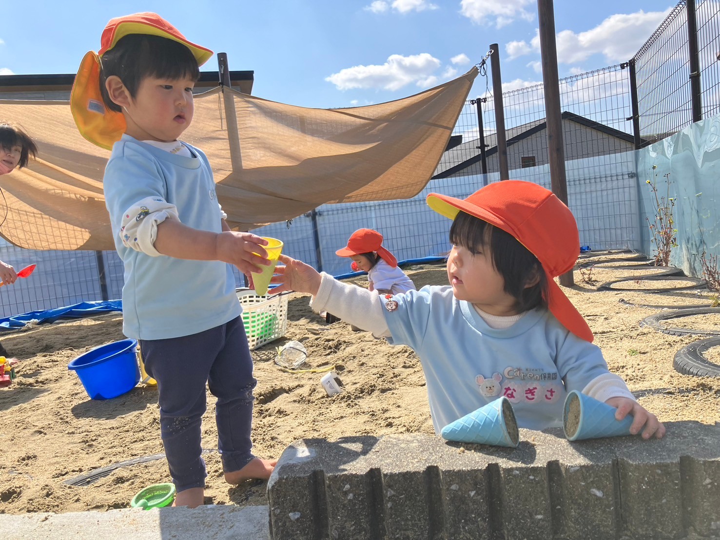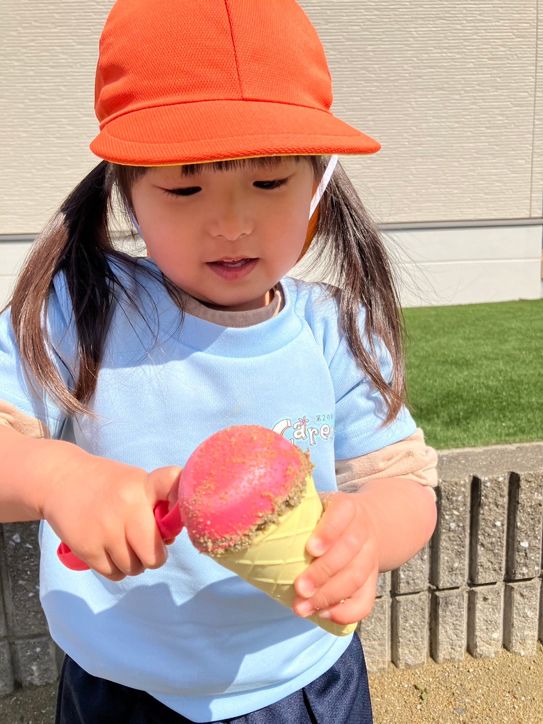 砂場のおもちゃを使ってカップやバケツに砂を入れて出してを楽しむ子や、アイスクリームを作ってお友達とアイスクリームやさんの見立て遊びを楽しむ姿がみられましたよ😊
