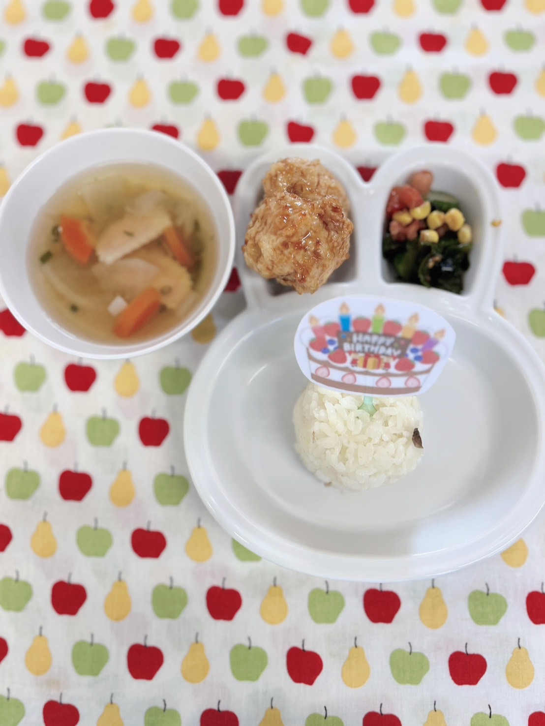 誕生会の後は今日でお別れになるお友達の希望で風船遊びをしました🎈。部屋の端から端に紐をつけその下に風船を吊り下げて叩いたりポンポンと触ったり、天井まで飛ばしたり、最後は天井から風船を落とすとなかなか落ちてこない風船にドキドキしながら待っていたパンダさん🐼。落ちてくると大興奮して喜んでいましたよ。【くりえいと園の今日の給食です】