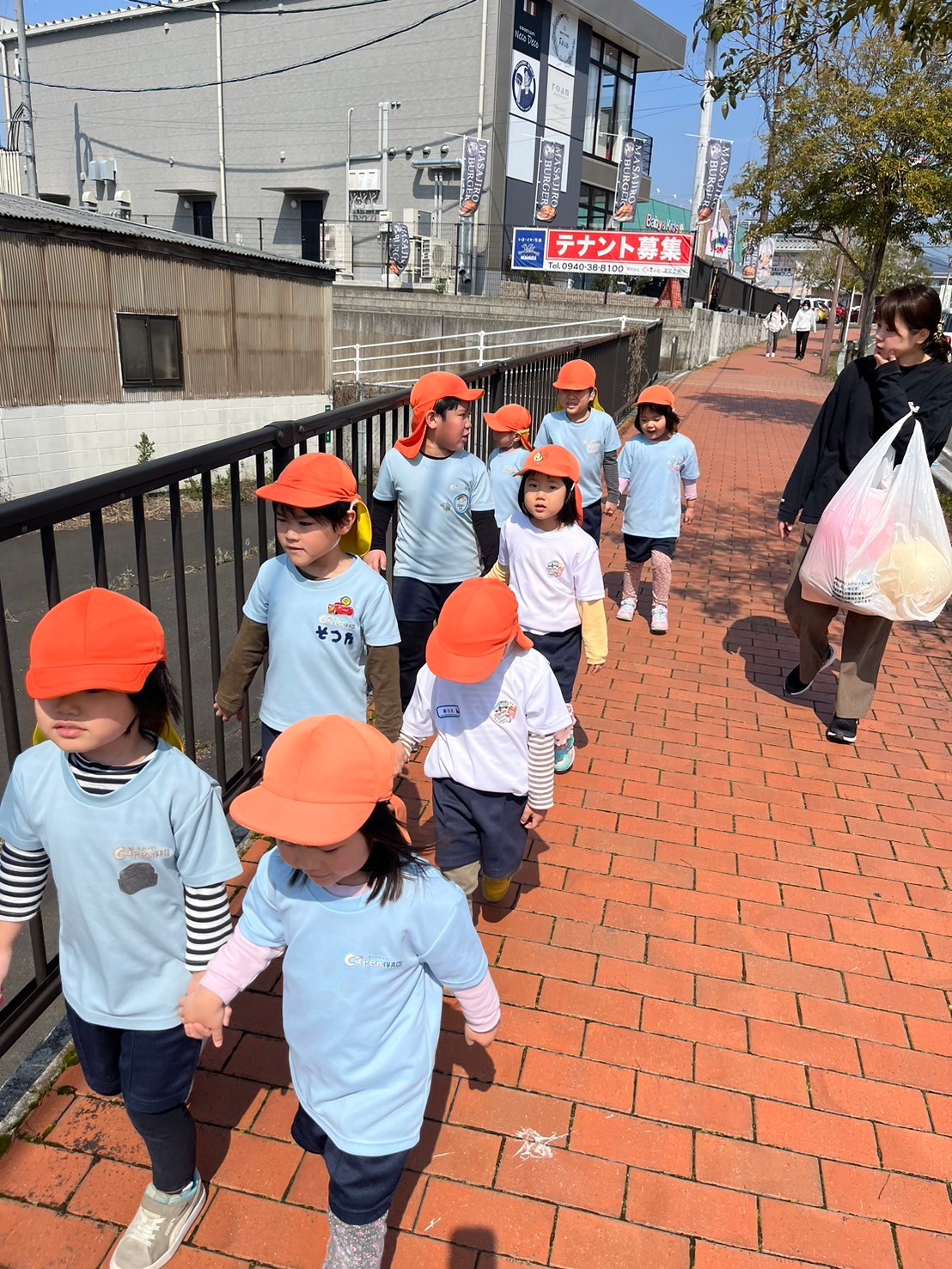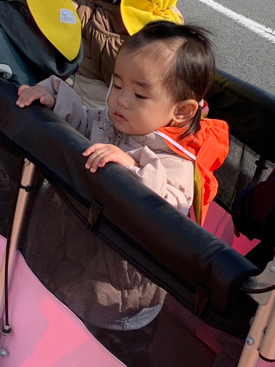 カートに乗って景色を眺めたり、車に手を振ったりして楽しんでいましたよ🥰先生と手を繋いで歩くお友だちは、石ころや落ち葉、お花など、地面にあるものが目に入るので、指差しして教えてくれたり、立ち止まって眺めたり、触ってみたりして楽しみました❣️