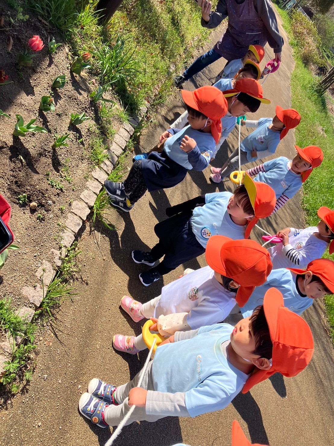 帰り道では、赤、ピンク、黄色のチューリップが咲いている事に気づき、チューリップの歌を歌って楽しく帰りました💕