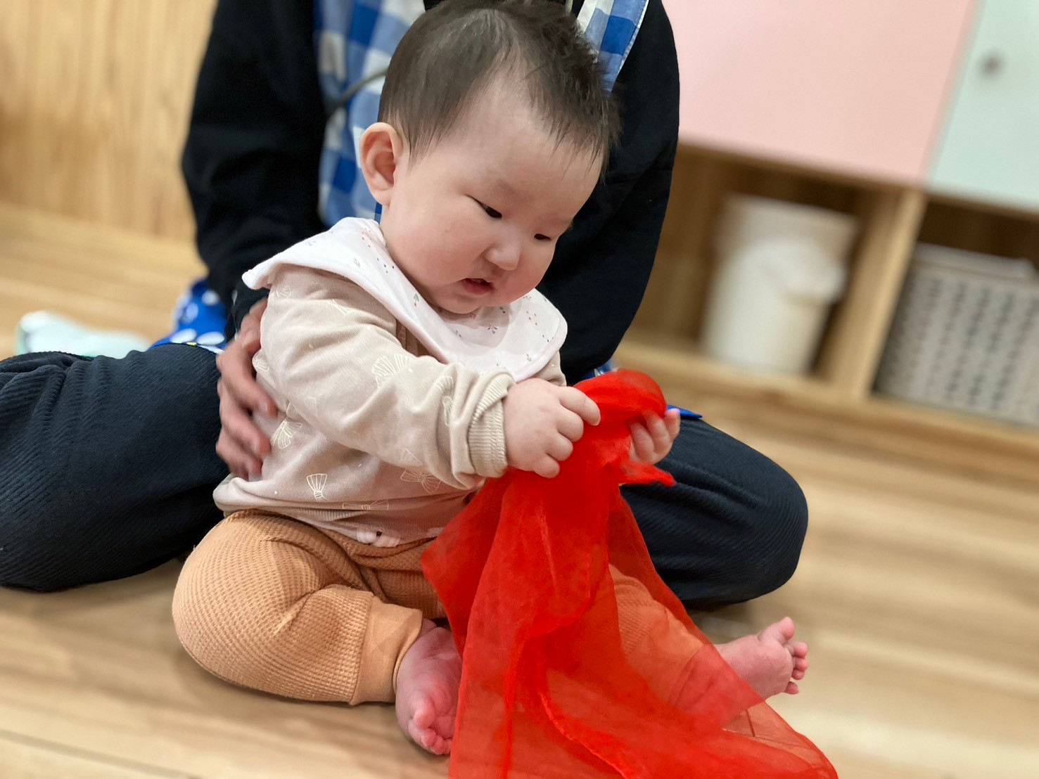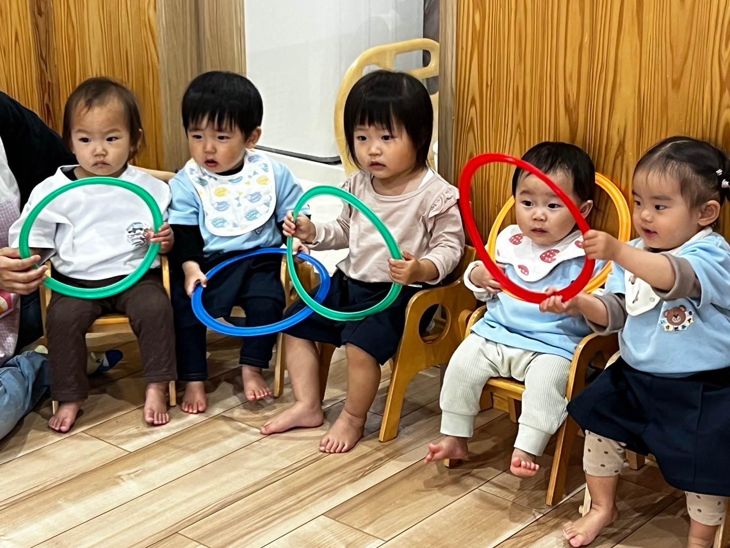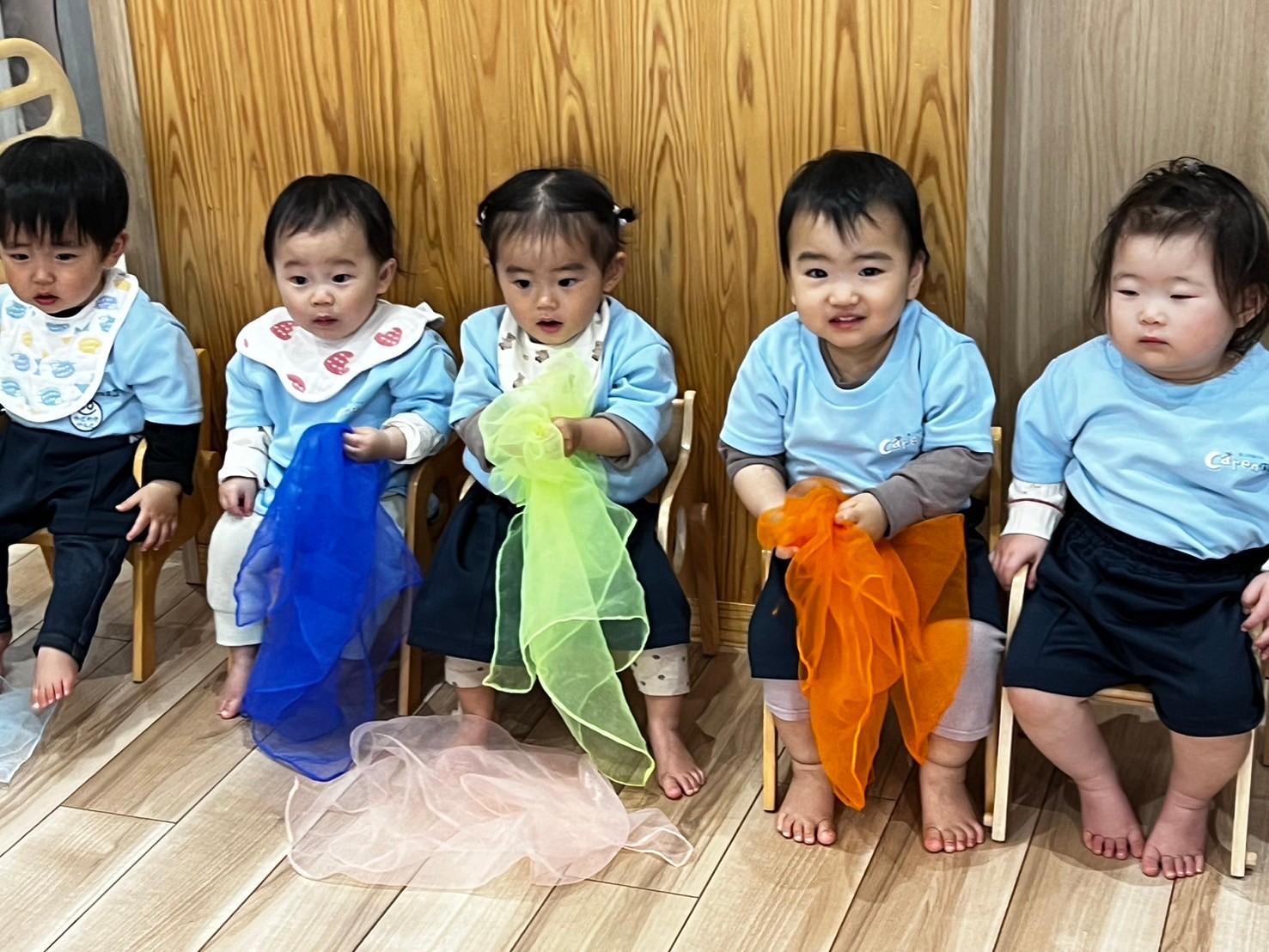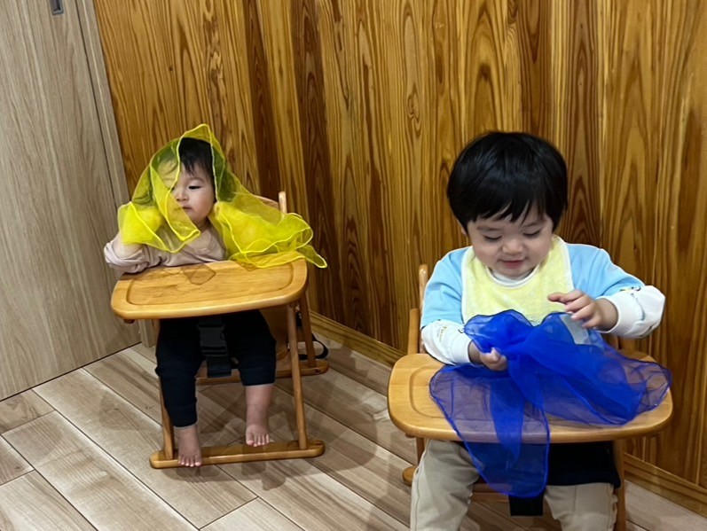リトミックにも参加してスカーフ🧣を触ったりフープを握ったり音楽を聴いて身体を揺らしたりと楽しみました😊