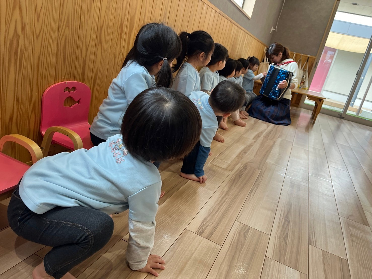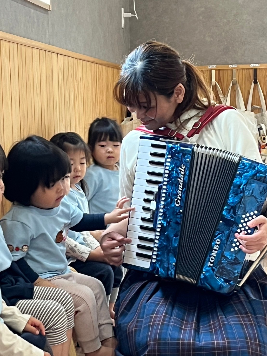 今年度初めてのリトミックに参加しました☺️先生がアコーディオンを持ってきてくれて、子どもたちに触らせてくれました🪗✨
