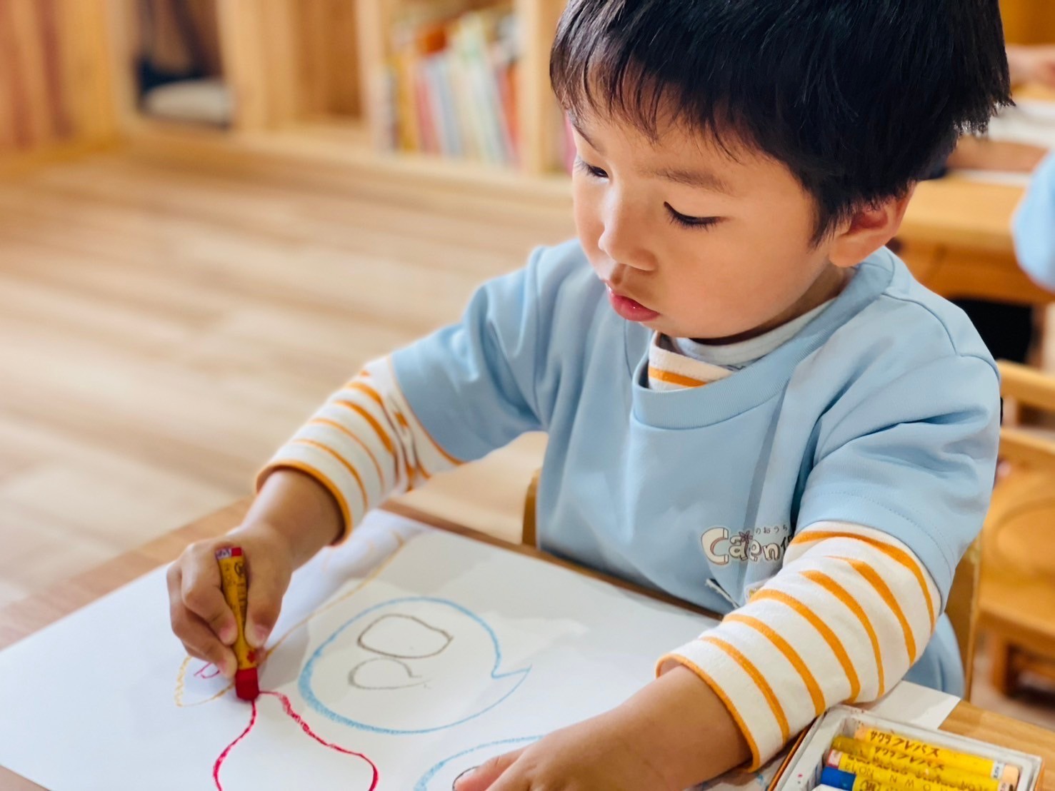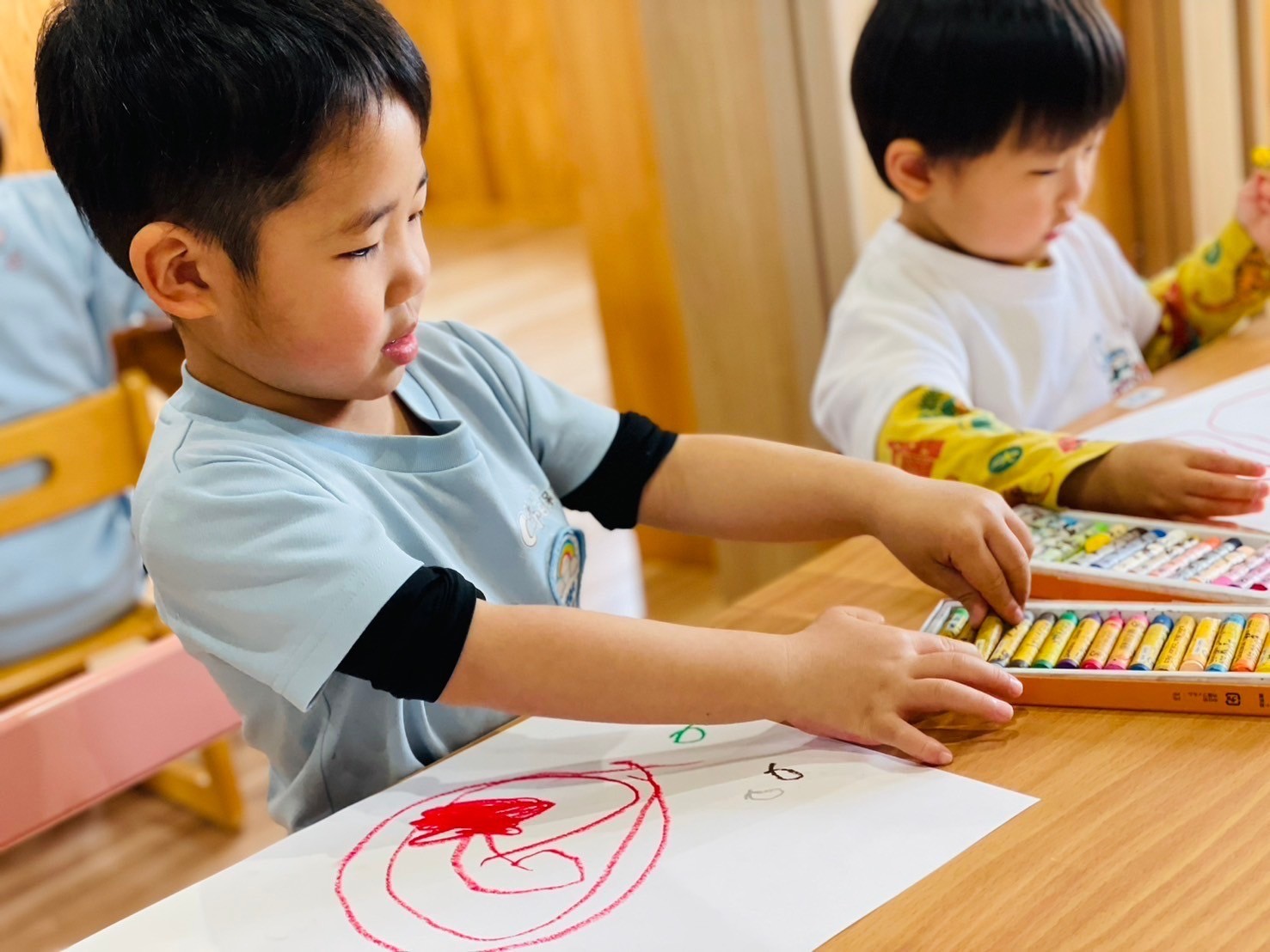 家族やお友達の絵を描く子もいれば、好きな色のクレヨンで殴り書きする子など、自由画を楽しんでいましたよ😊🖍️⭐️