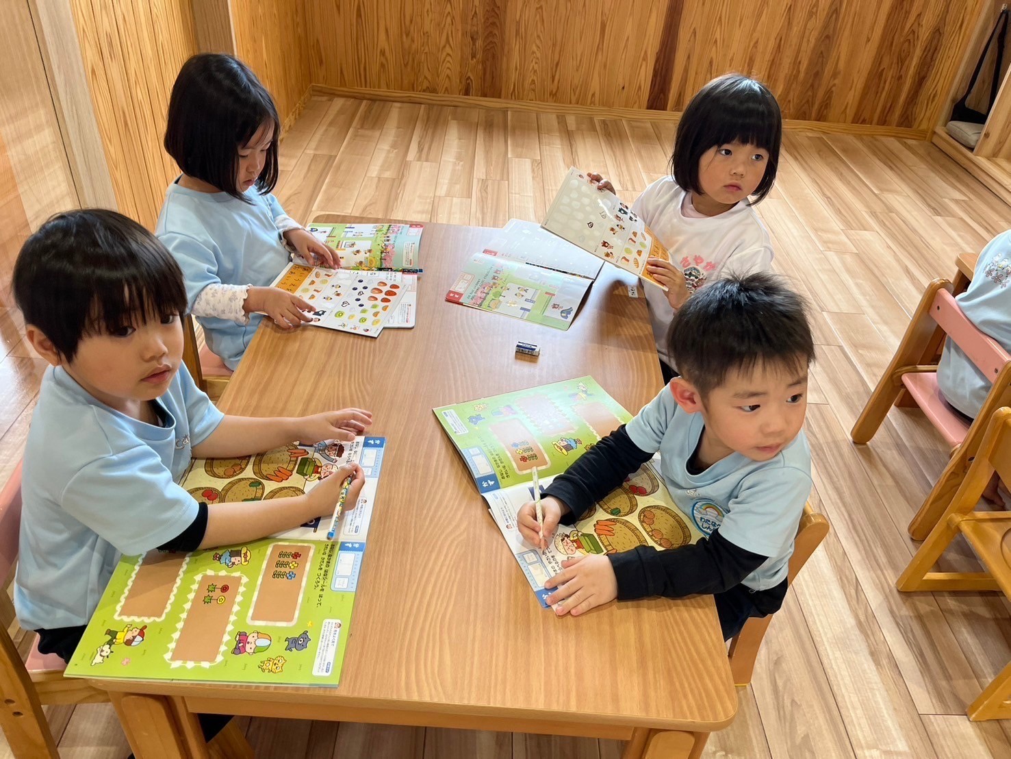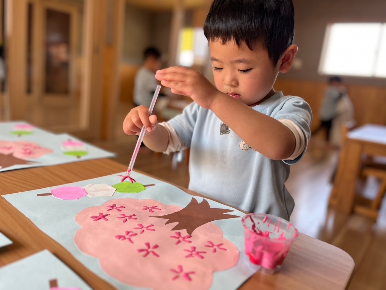 その後はポピーで仲間分けのシール貼りをしたり、うさぎ組は4月の製作では、ストローを使って桜の花のスタンプを押しました🌸