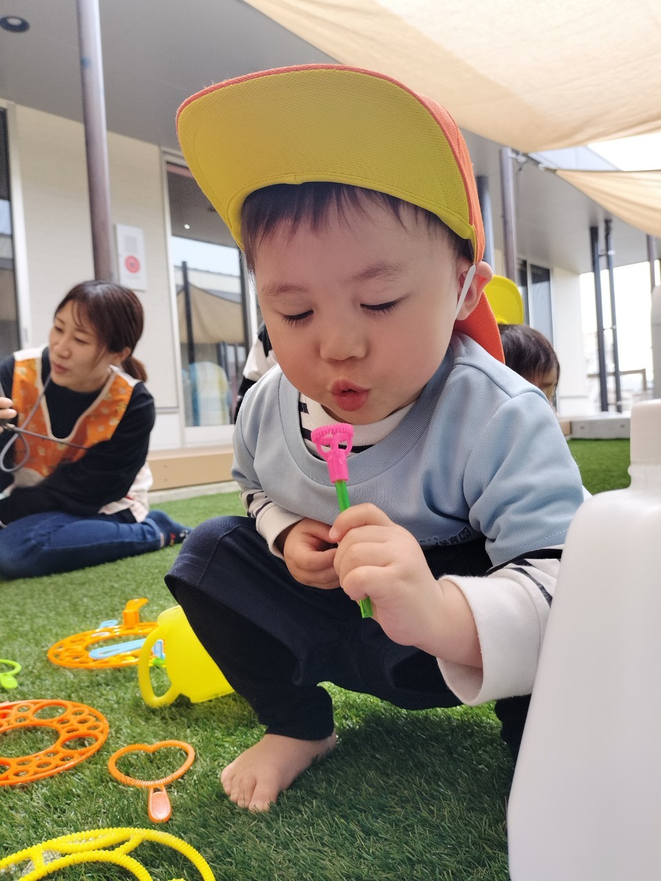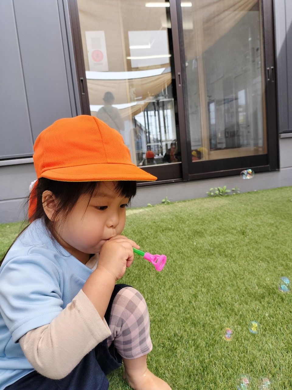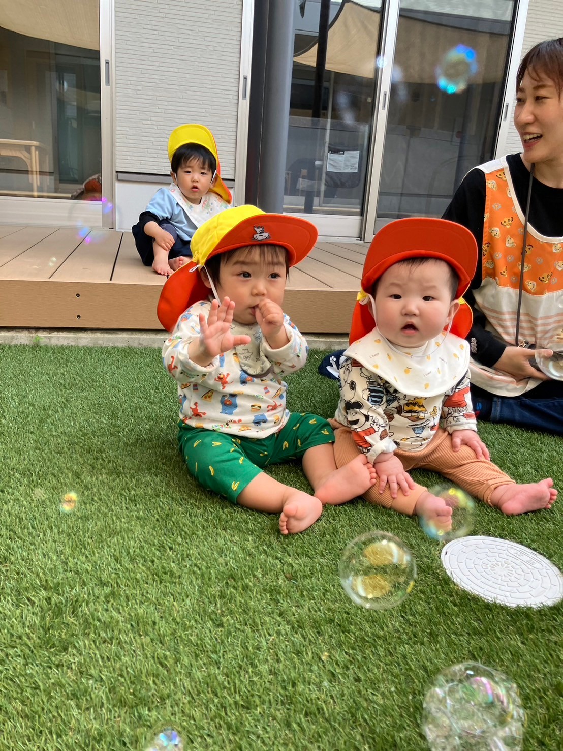 その後、園庭でシャボン玉🫧をしていきました🤗興味津々に目で追いかけたり動ける子は触りにいったり探索して楽しみましたよ✨りす🐿
