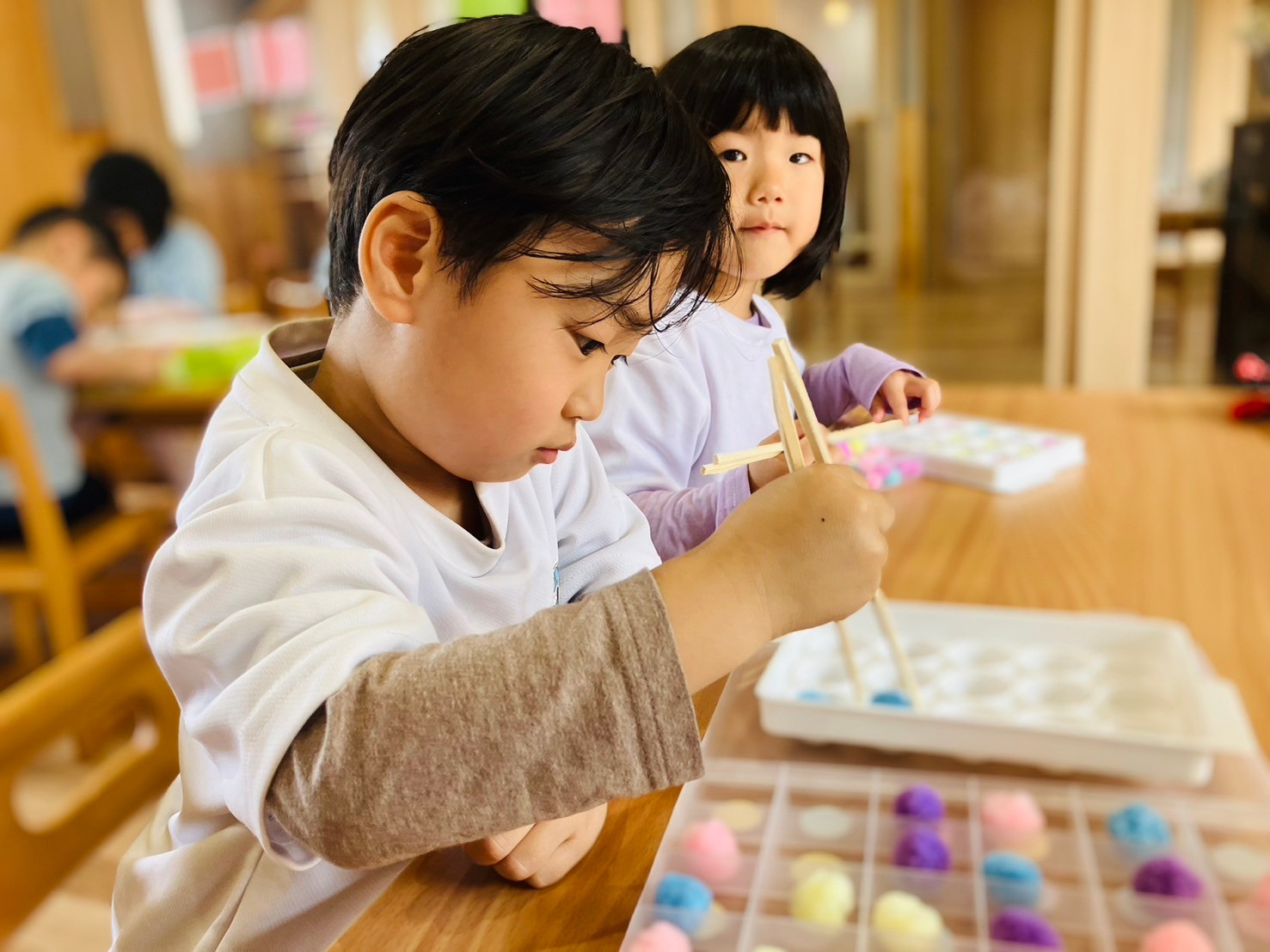 その後は箸遊びをし、箸の正しい持ち方を再確認しながら、スポンジ移しを楽しみましたよ🥢✨【くりえいと園の今日の給食です】