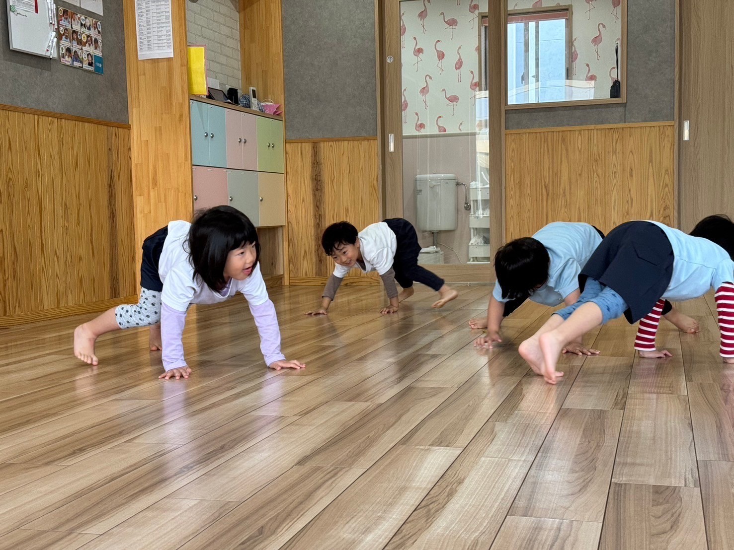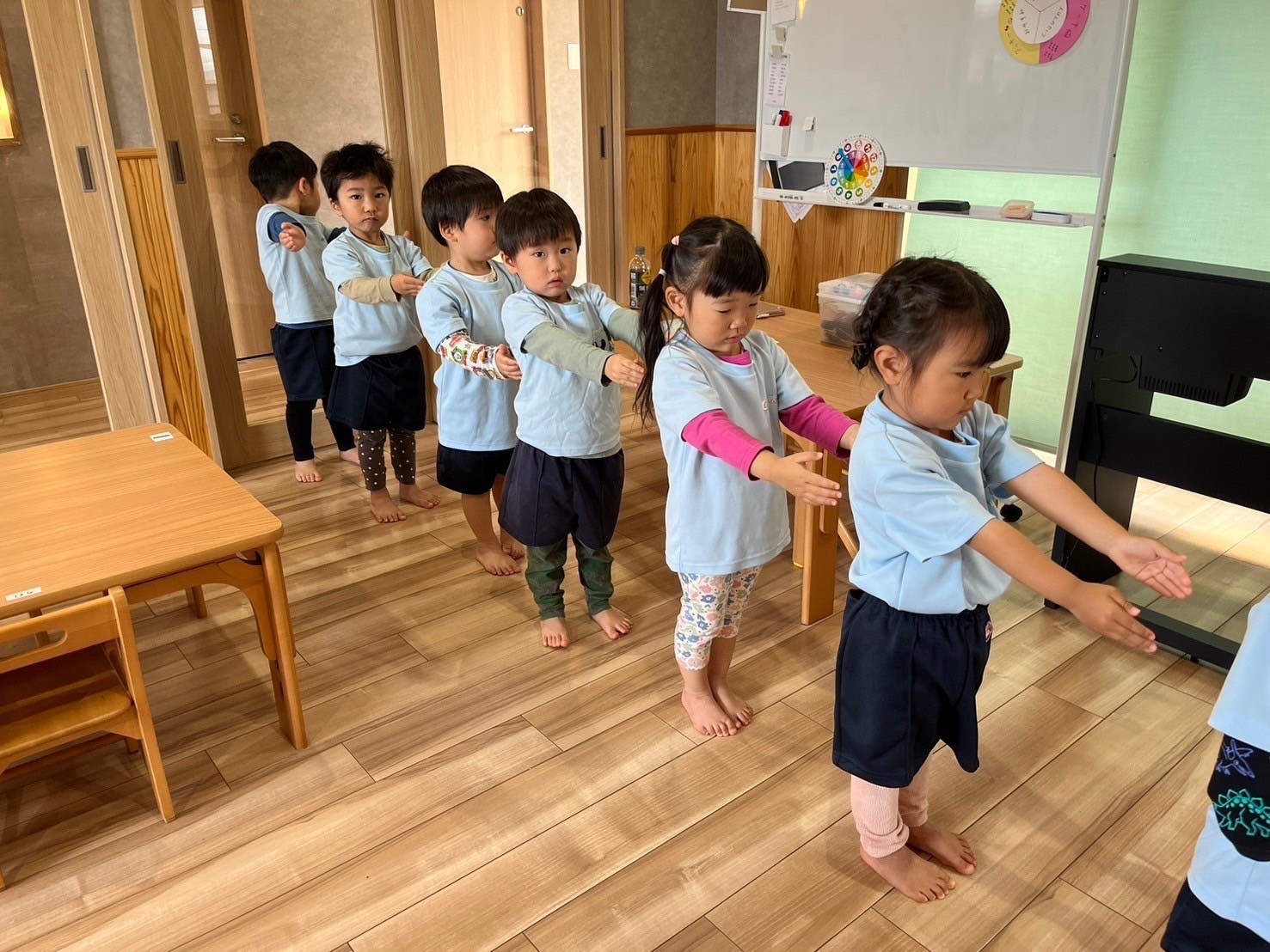 今日はお部屋の中で、年中、年長さんと一緒にさくらんぼリズムをしました🍒