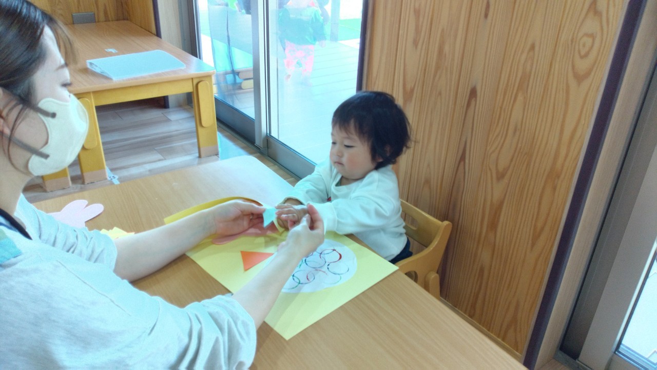 うさぎを糊で貼って頑張って作りましたよ🐰その後は園庭でシャボン玉やボール遊びをしました🌞キレイなシャボン玉を追いかけたり、ボールをポーンと投げたりして元気いっぱい遊びましたよ😆💕ひよこ組さんと一緒に日向ぼっこも嬉しそうでした✨それから身体測定もしました。順番で測定してもらい、大きくなったことが嬉しいりす組さんでした✌️😄ぱんだ🐼ぐみ