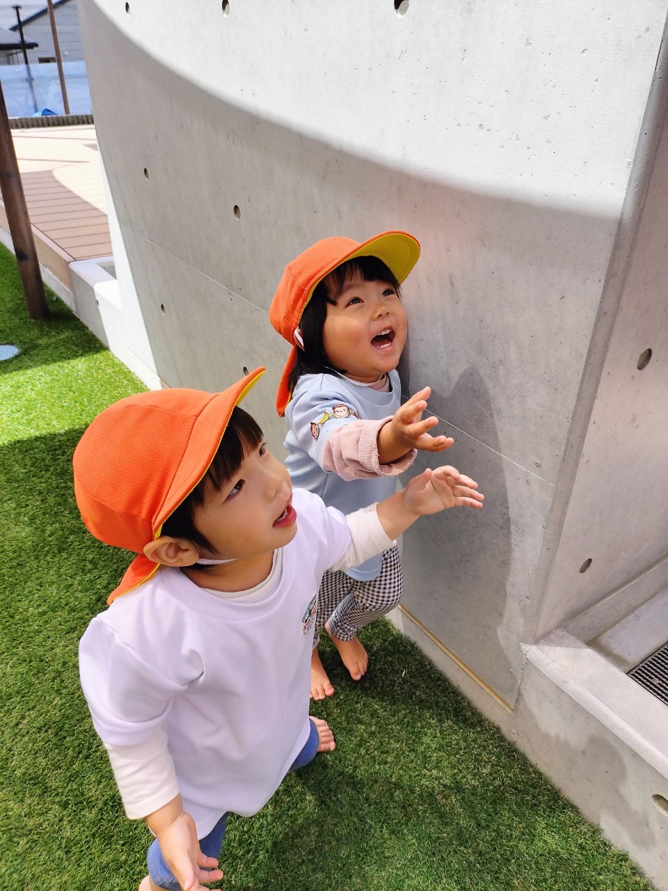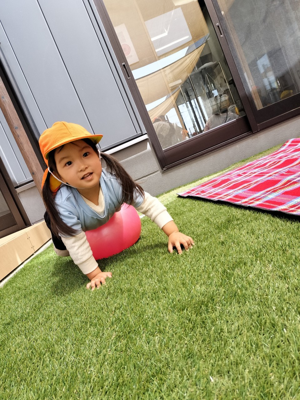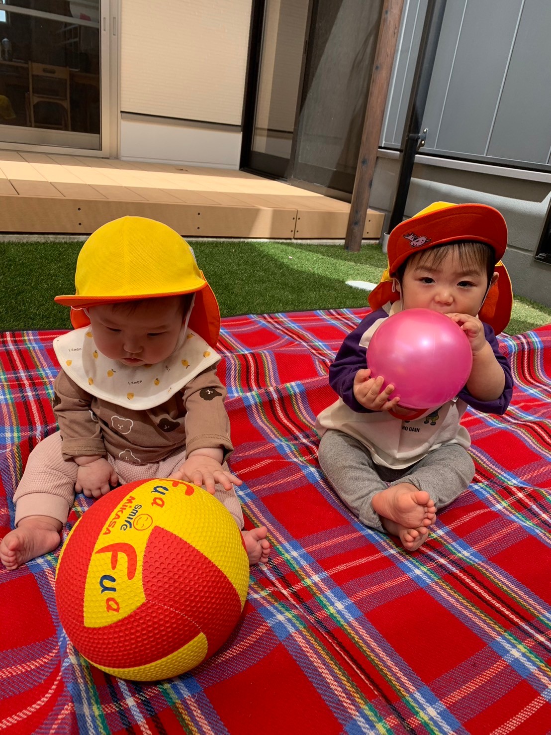 今日は園庭にシートを敷いて、りす組さんやぱんだ組さんがボール遊びやしゃぼん玉をしているのを見ながら外気浴を楽しみましたよ❣️