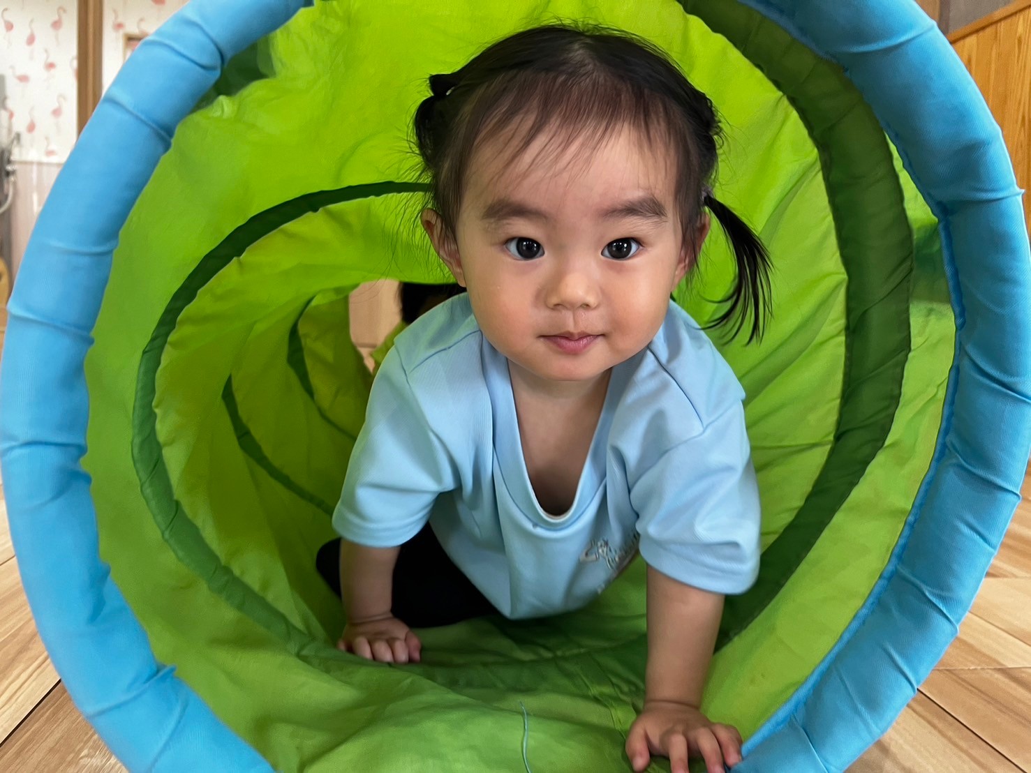 自分のマークシールの場所に座って先生の話を聞き、音楽がなると、おうまやカメ、あひるになりしっかり音を聞いて座ったり立って動くことができていましたよ🤩 その後は運動遊びをしました!滑り台やトンネルを楽しみましたよ♪トンネルはなかなかいけない子もいましたが進んでいくお友達を見て挑戦していていたりす組さんです🥰ぱんだ組🐼