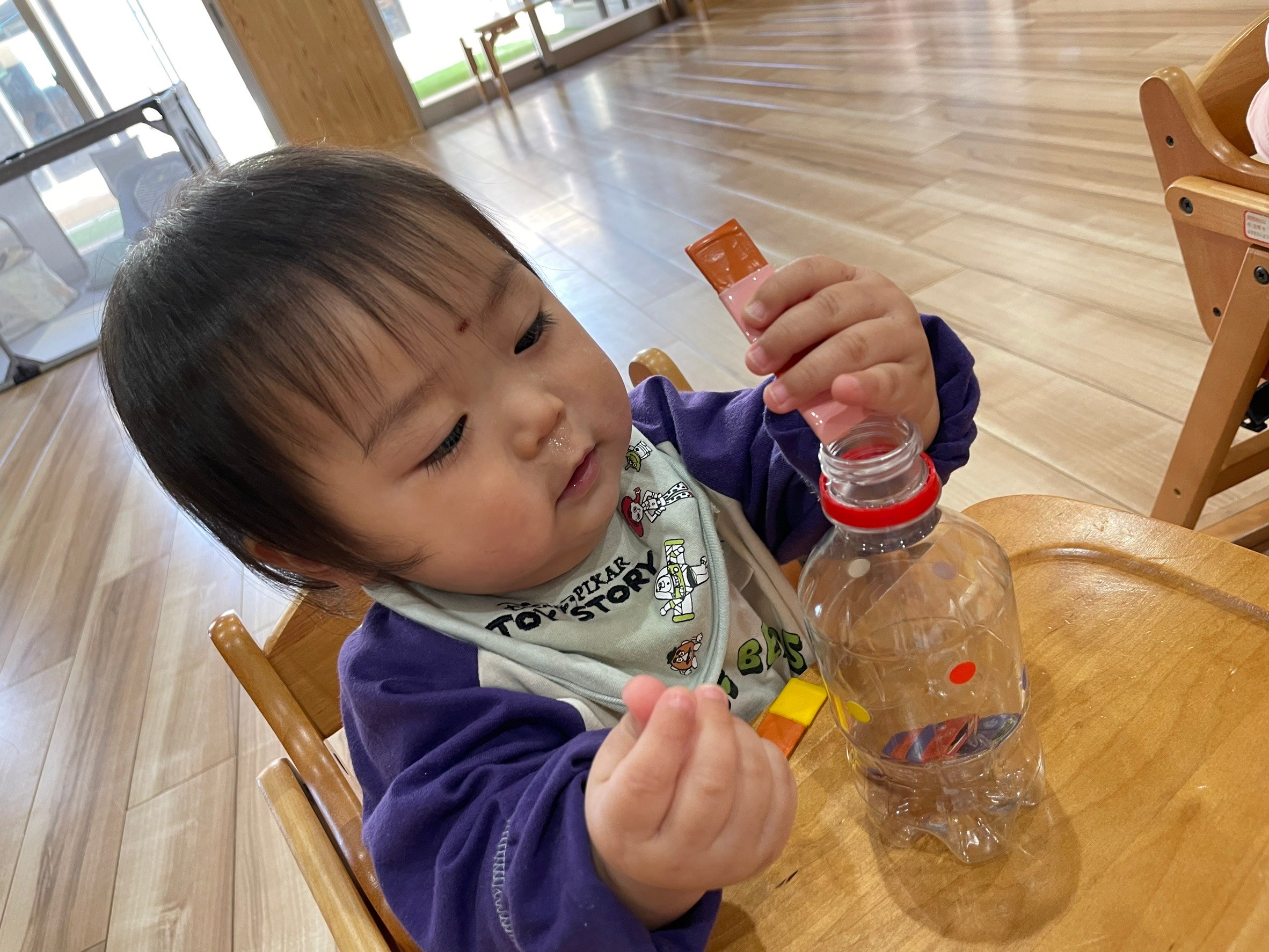 紙の棒を容器の中に入れる事を伝えると、手に持ち集中して取り組んでいました🥰