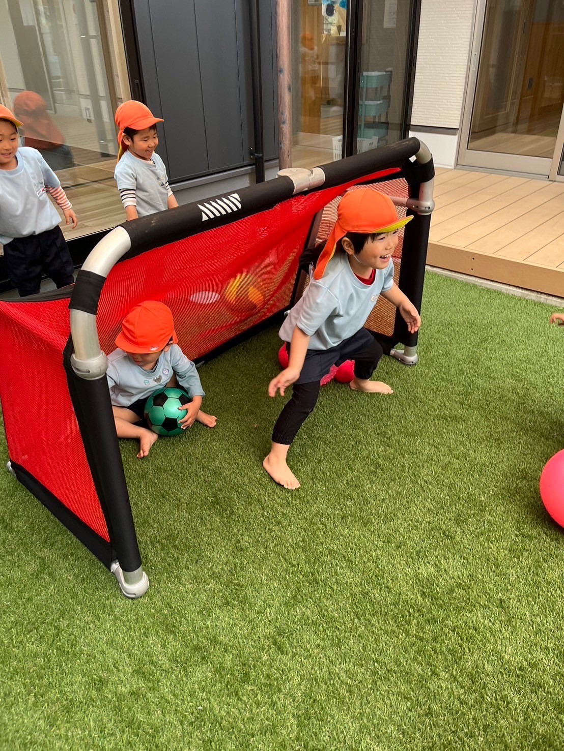 サッカーゴールを出すと、ゴールに入って遊んだり、友達とサッカーをして楽しんでいましたよ☺️✨【くりえいと園の今日の給食です】
