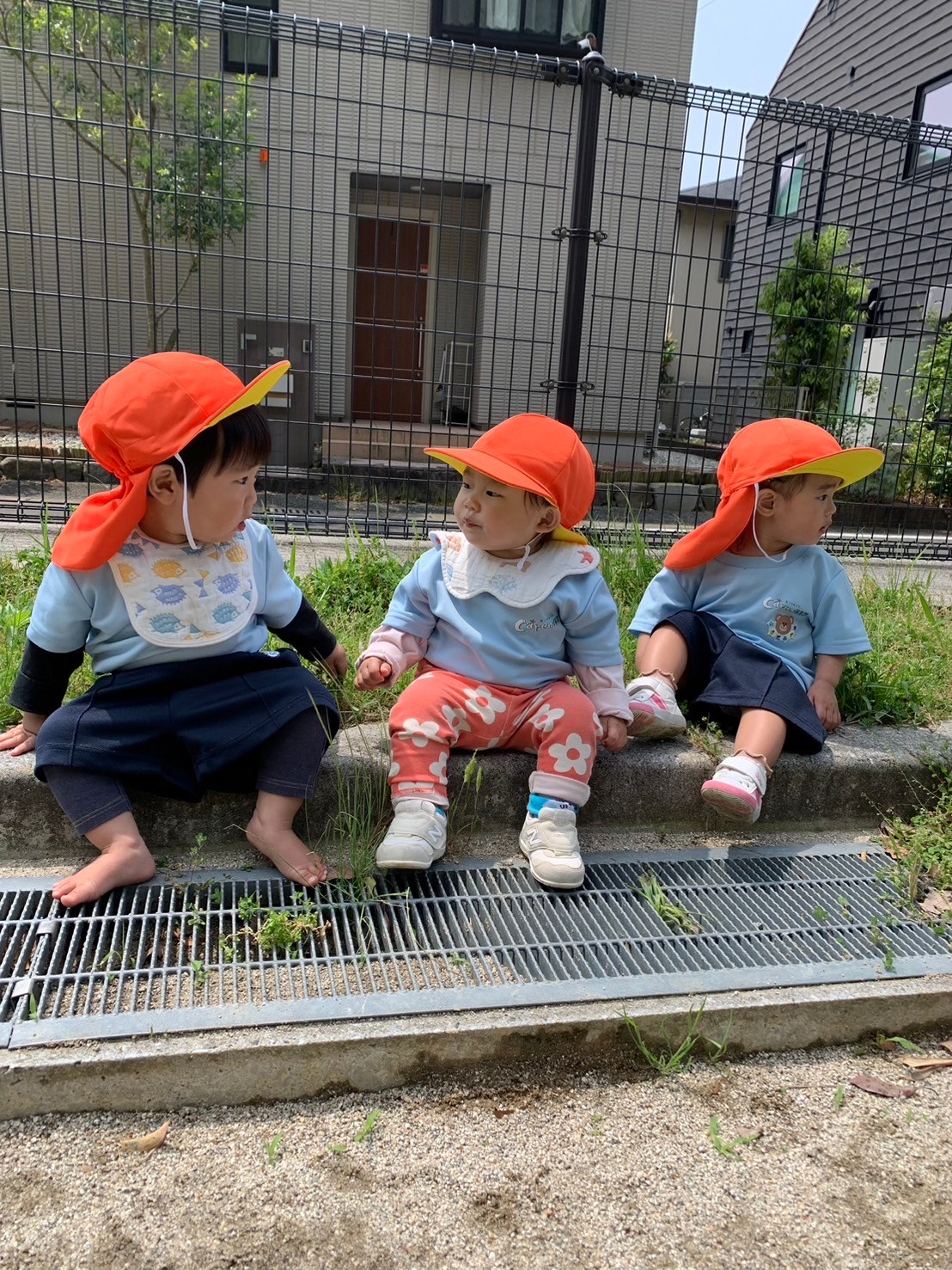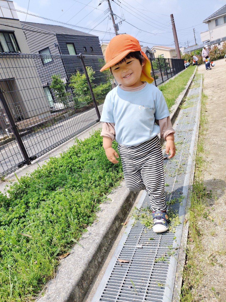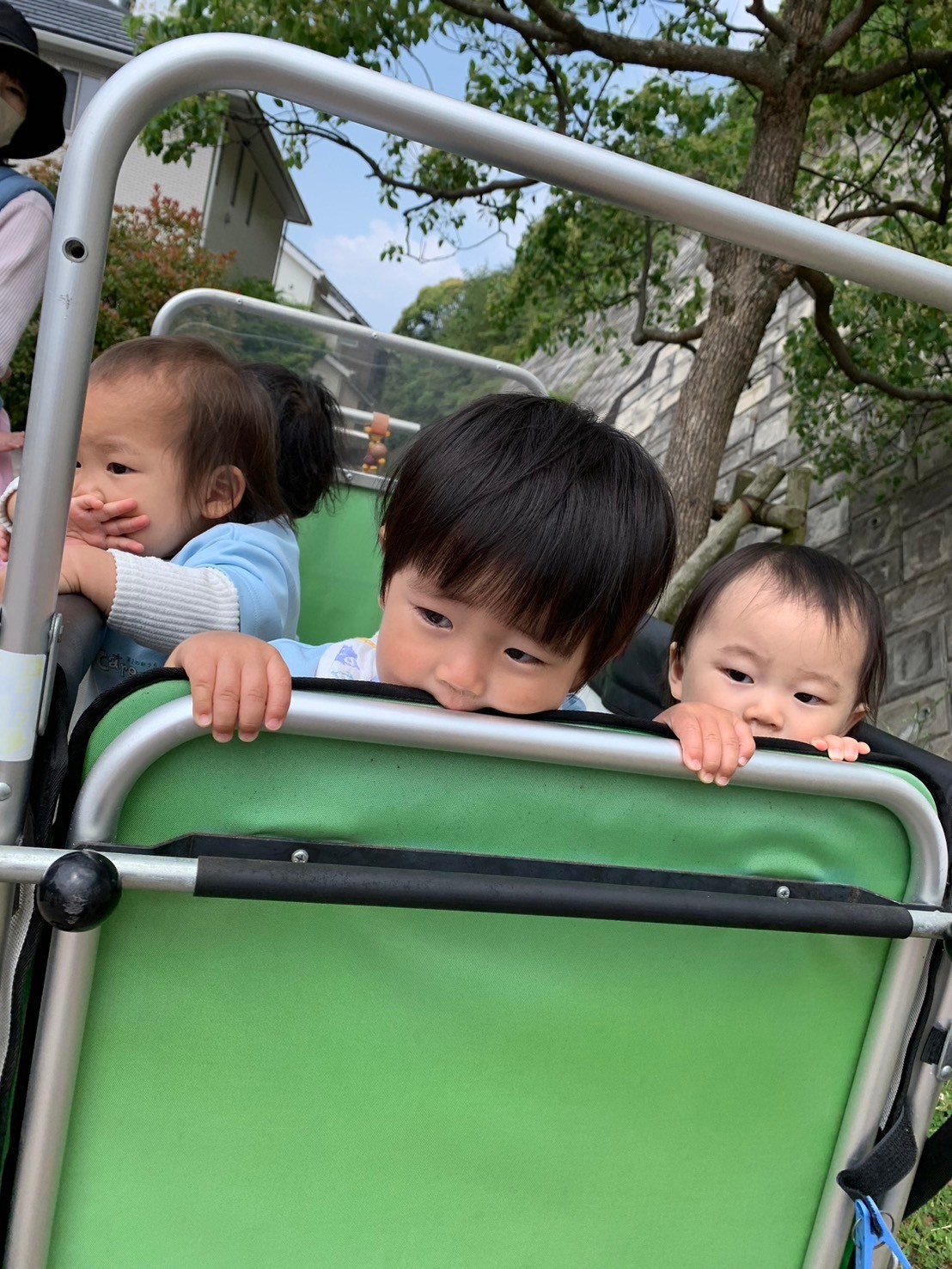 カートに乗ったお友だちは風を受けて目を細めながらも周りの景色を眺めて楽しみ、横断歩道を渡る時に手を上げているお友だちもいましたよ❣️先生と手を繋いで歩くお友だちは草花や虫を見つけてゆっくりとお散歩を楽しみました❣️