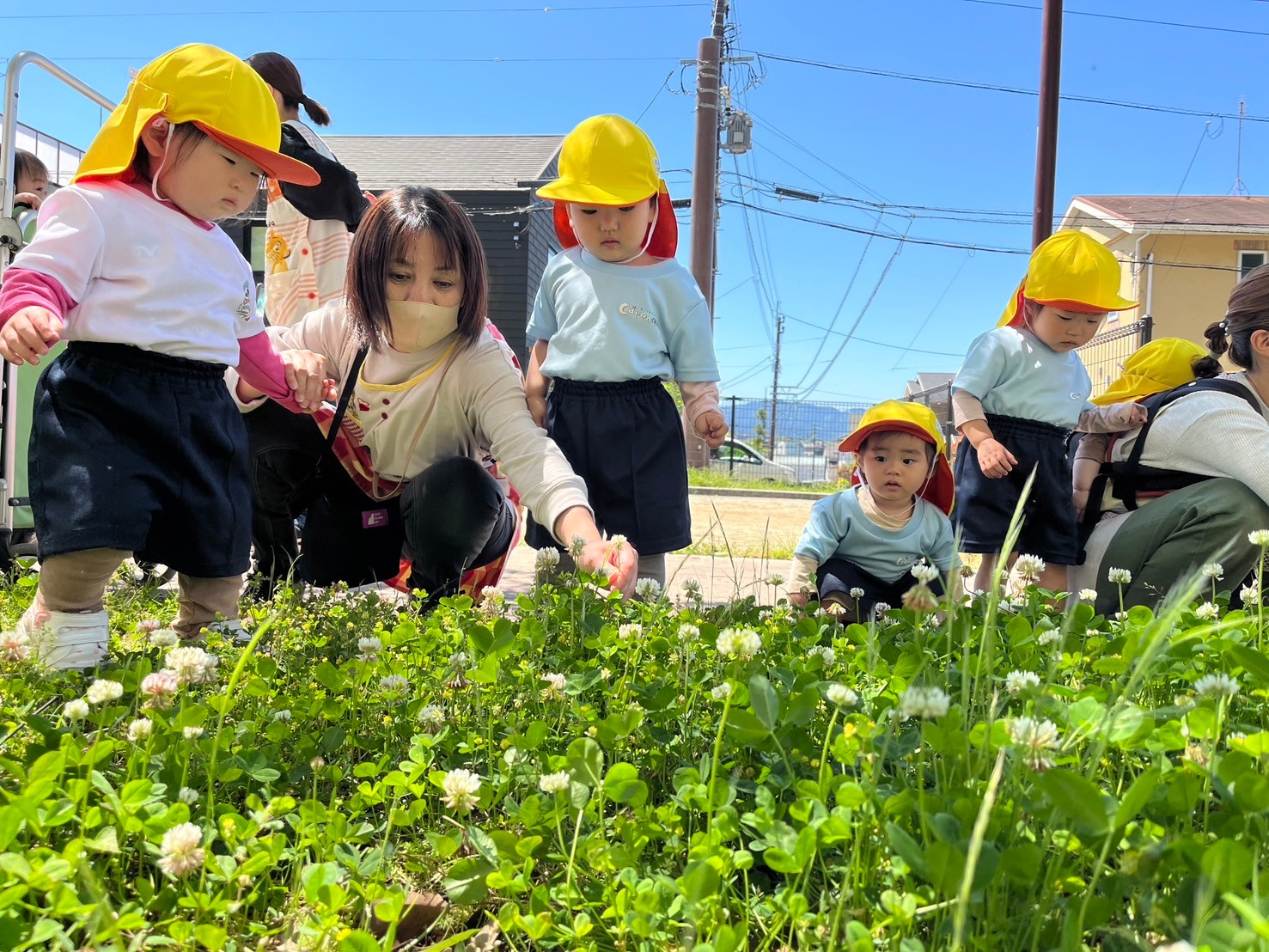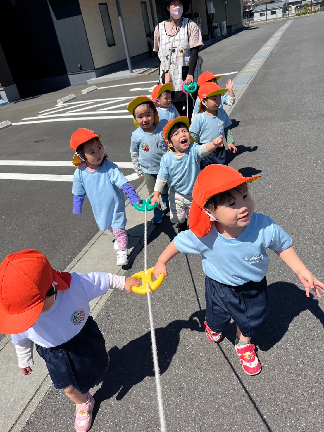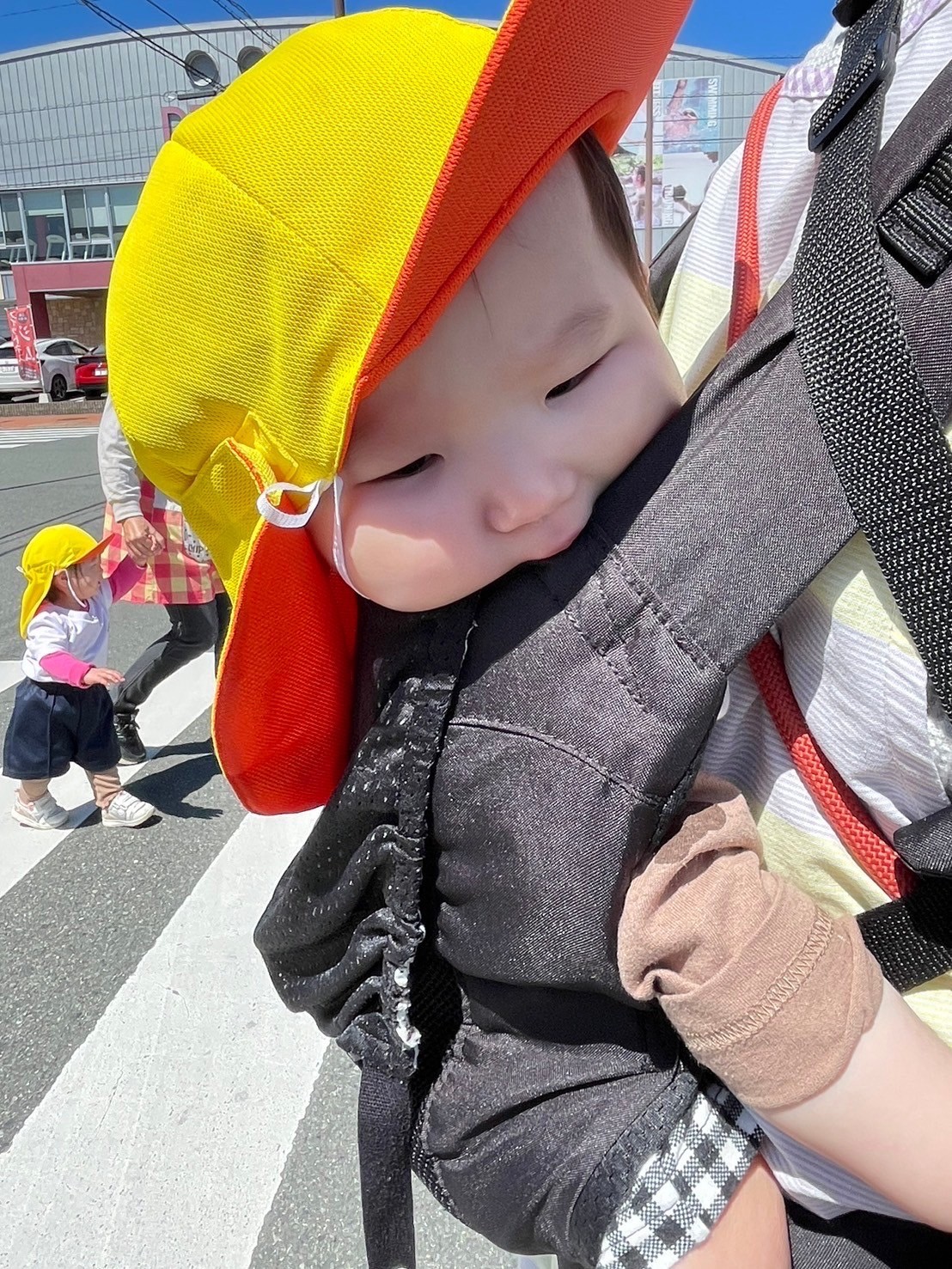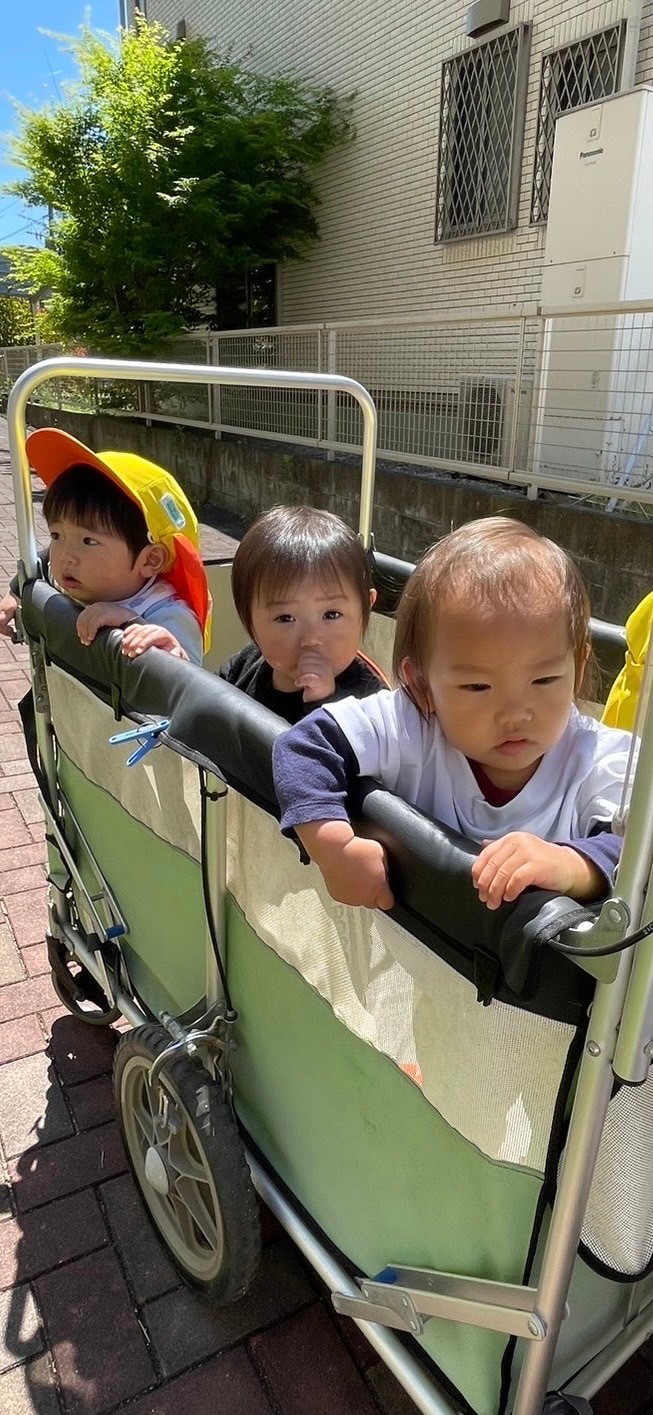 日差しが気持ちよく、おんぶで寝てしまったお友達もいましたが、カートのお友達はしっかりカートの縁を握りキョロキョロ景色を眺め、鯉のぼりや蝶々を見つけて喜んでいました💕