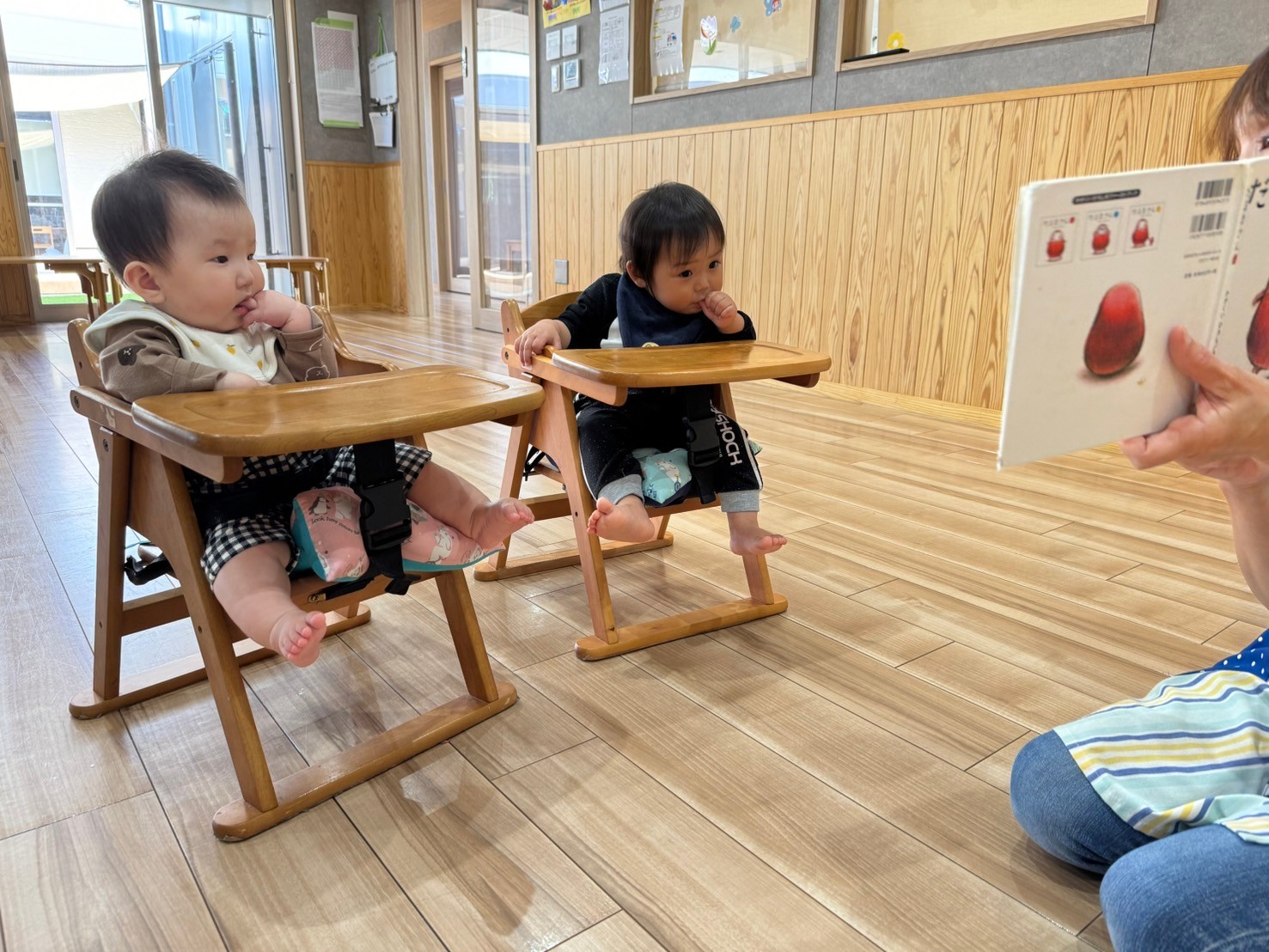 保育者の歌声を聞いたりスキンシップを喜んでにこにこ笑顔が見られました😍