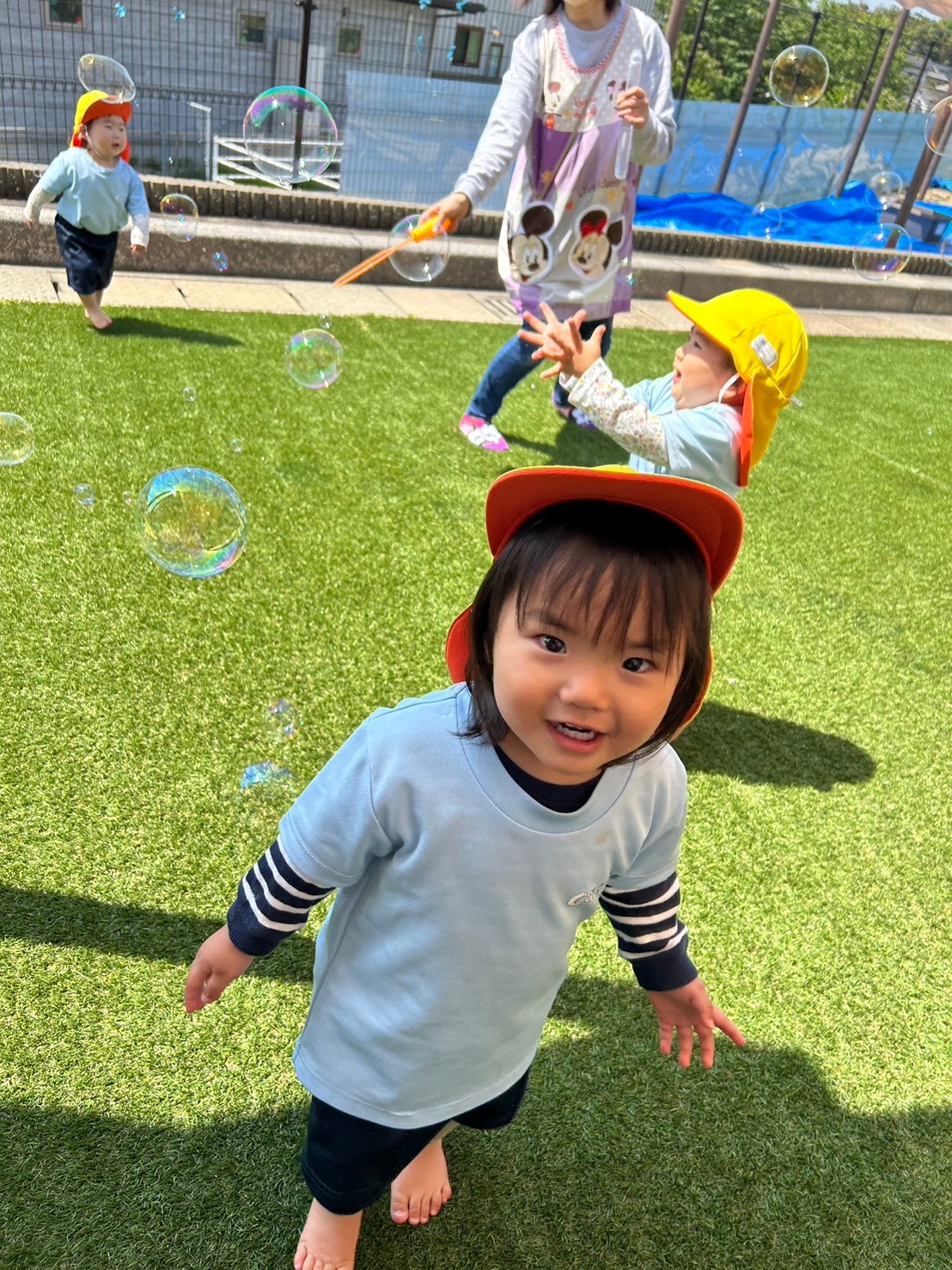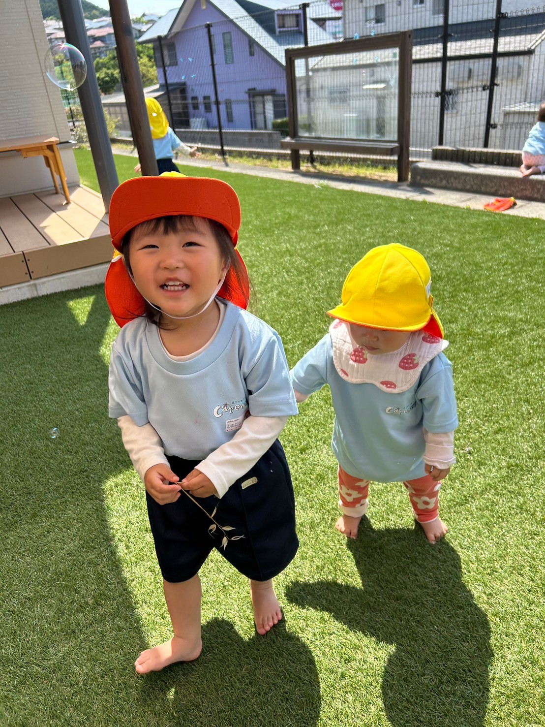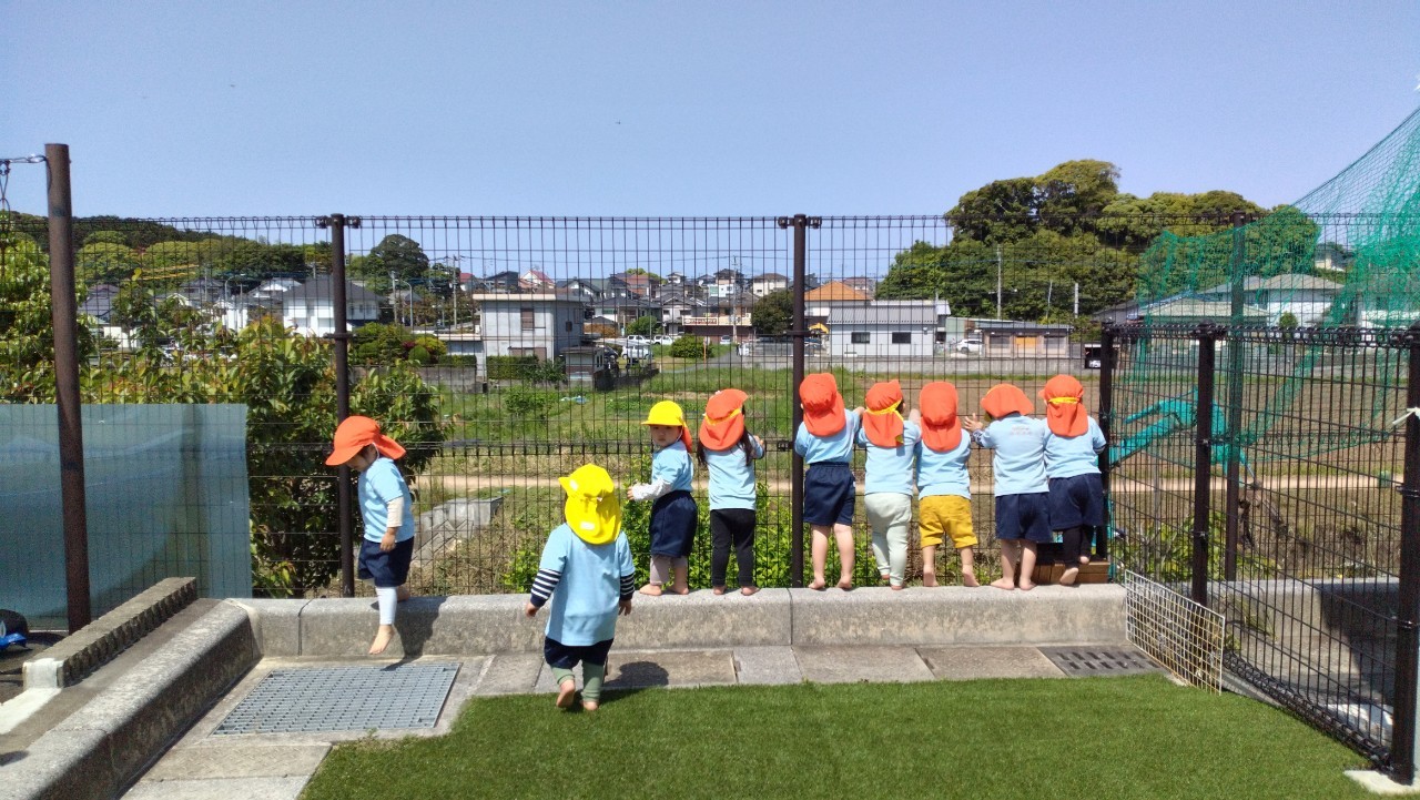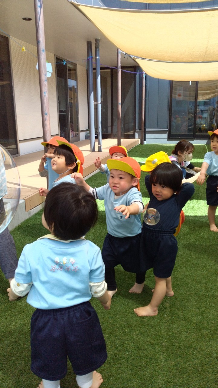 手遊びや英語カードに大喜びで反応しながら楽しく参加しましたよ😄その後は園庭でひよこ組さんやりす組さんと一緒に遊びました🌞シャボン玉を大はしゃぎで追いかけたり、フェンスから外の景色を覗いて工事中のショベルカーを見つけて大興奮の