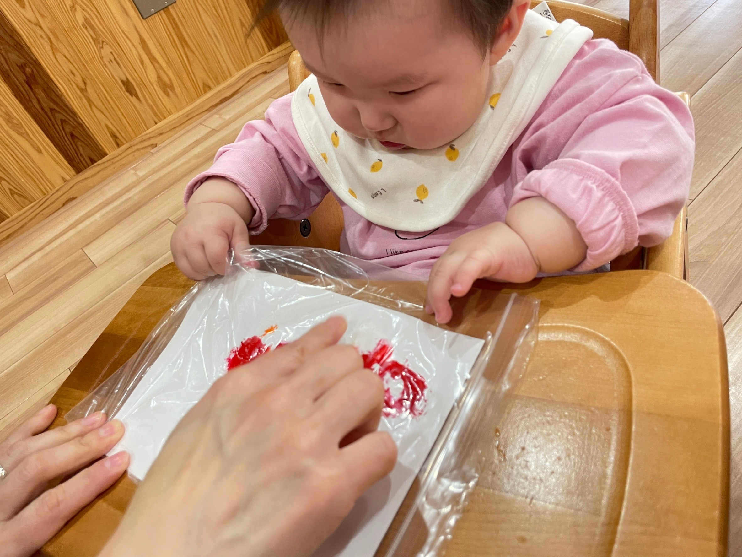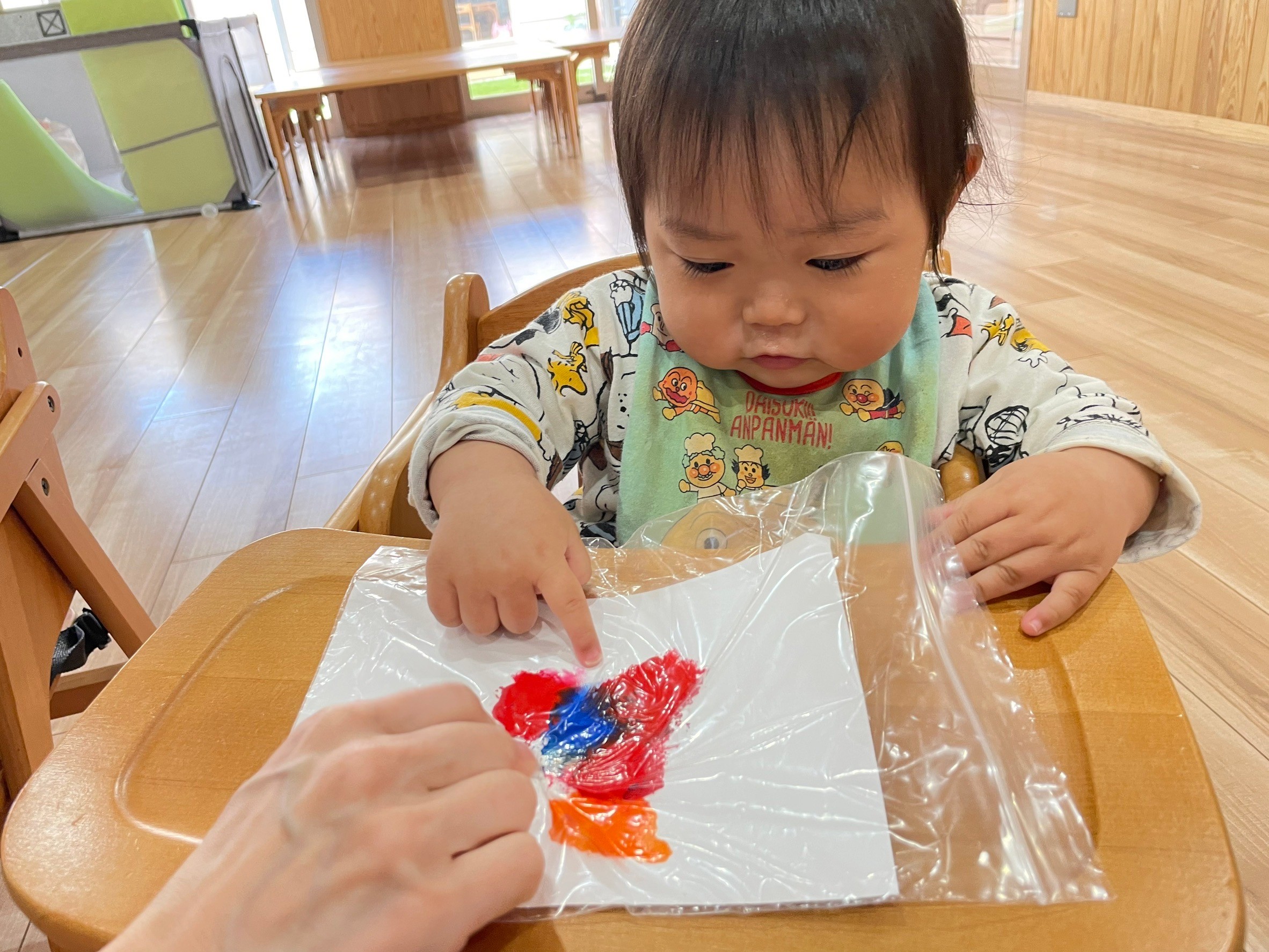 絵の具の感触を楽しんだり、色と色が混ざり合うと違う色に変化する過程を見たりと、たくさんの発見がありました😆