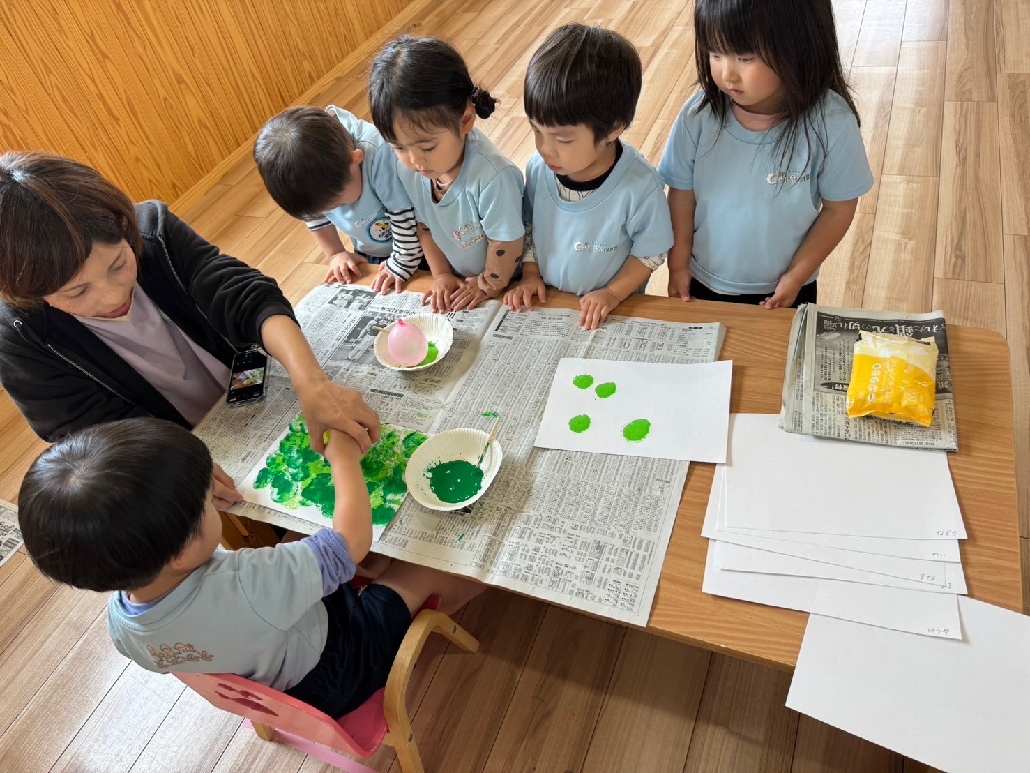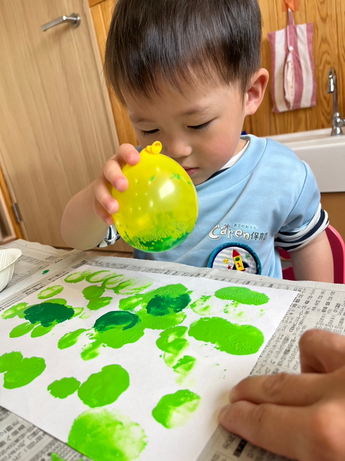 今日は月製作をしました🫛緑と黄緑の絵の具を風船で画用紙にスタンピングに、順番を待ち望んでいる子どもたち🤩自分の番になると集中して取り組めてました💗その後は園周辺を散歩しました🌻ショベルカーを見たり、カエルや鳥の鳴き声に耳をすませる子どもたちでした🥹✨うさぎ、こあら、きりん組