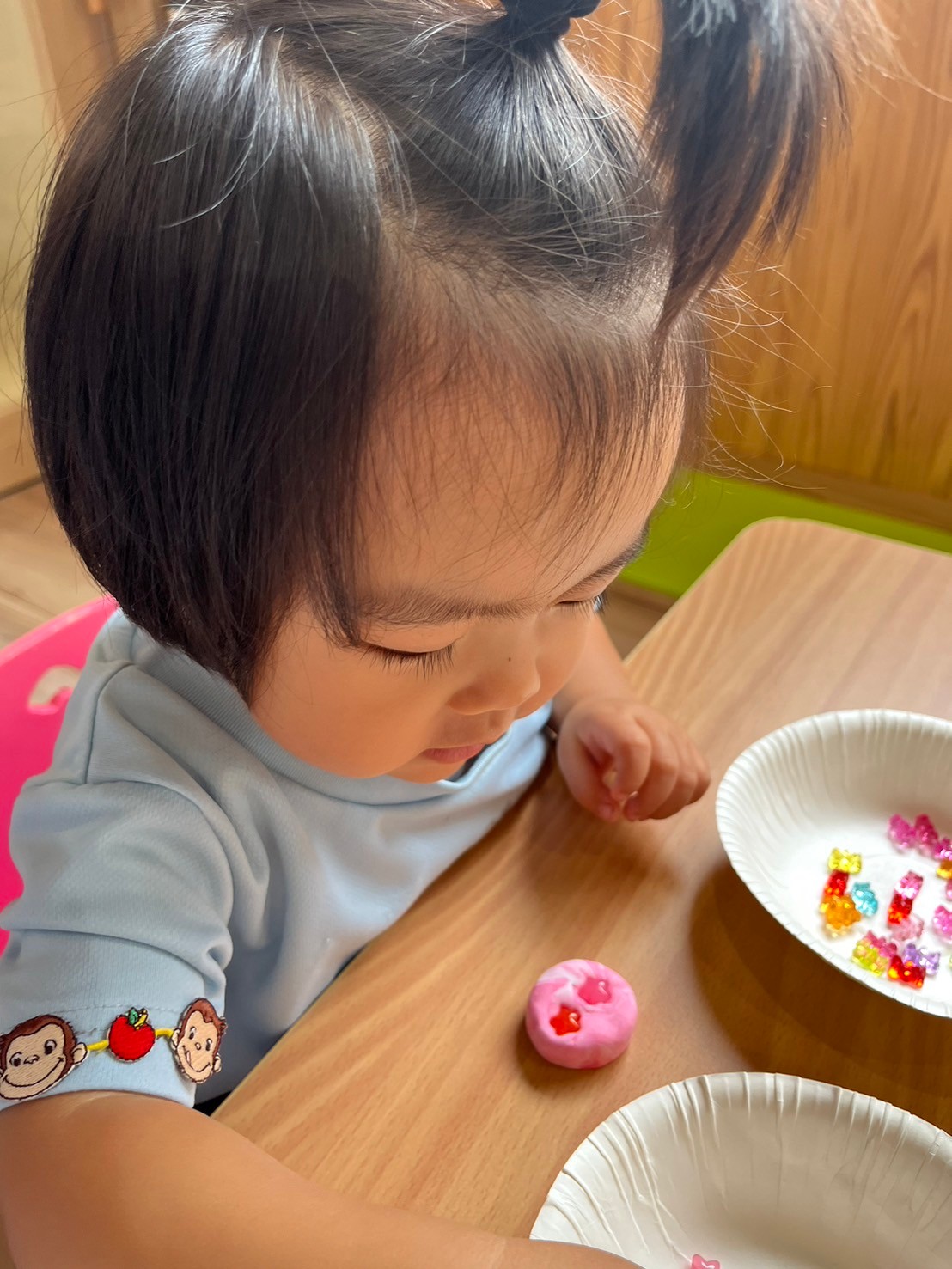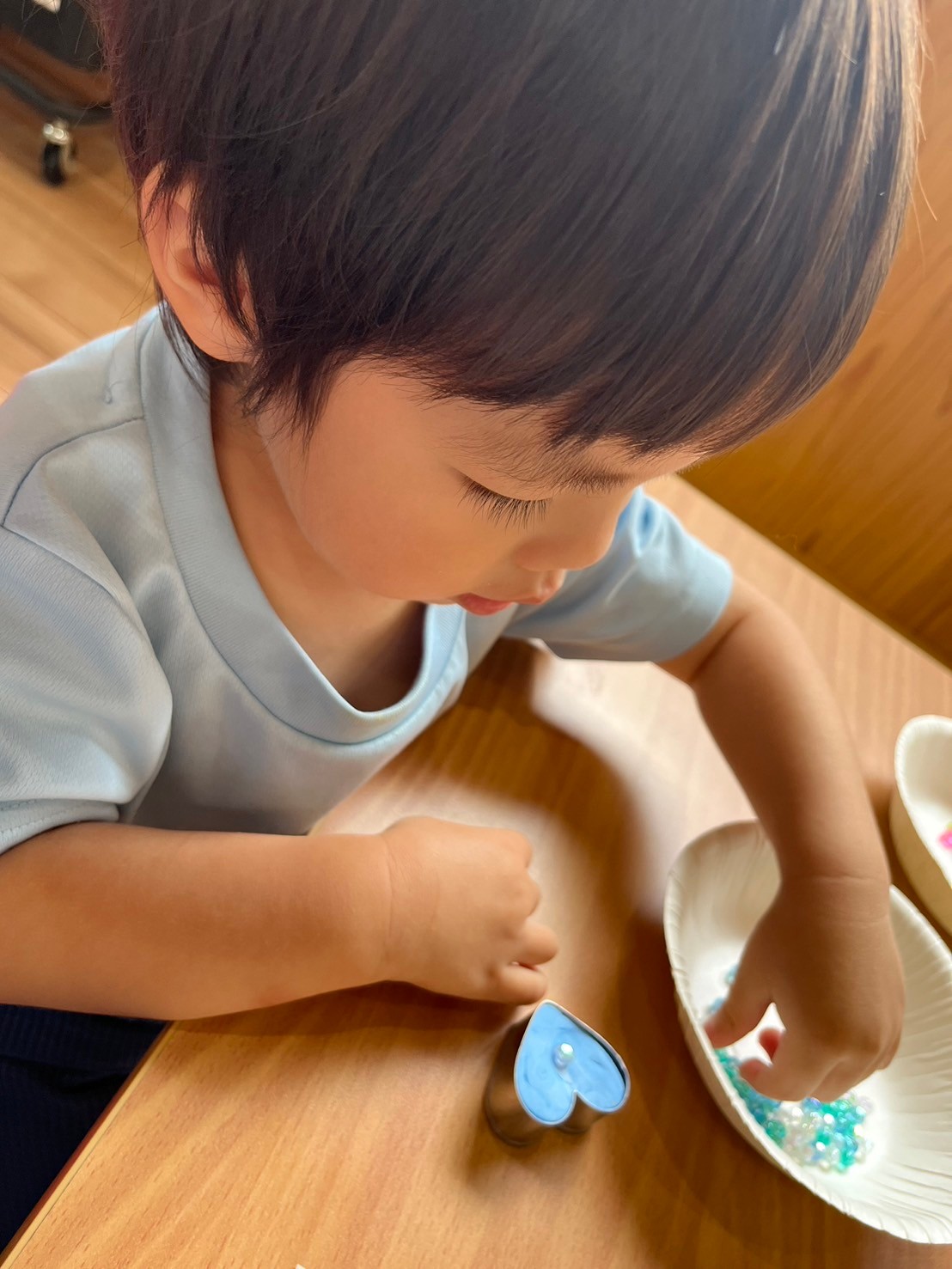 その後身体測定をして大きくなったことを伝えると喜んでいました🥰その後ファミリーデーのプレゼントを作りました🎁紙粘土に好きな絵の具をまぜた後、キラキラビーズを自分で選んで飾りつけして楽しそうでした💎✨