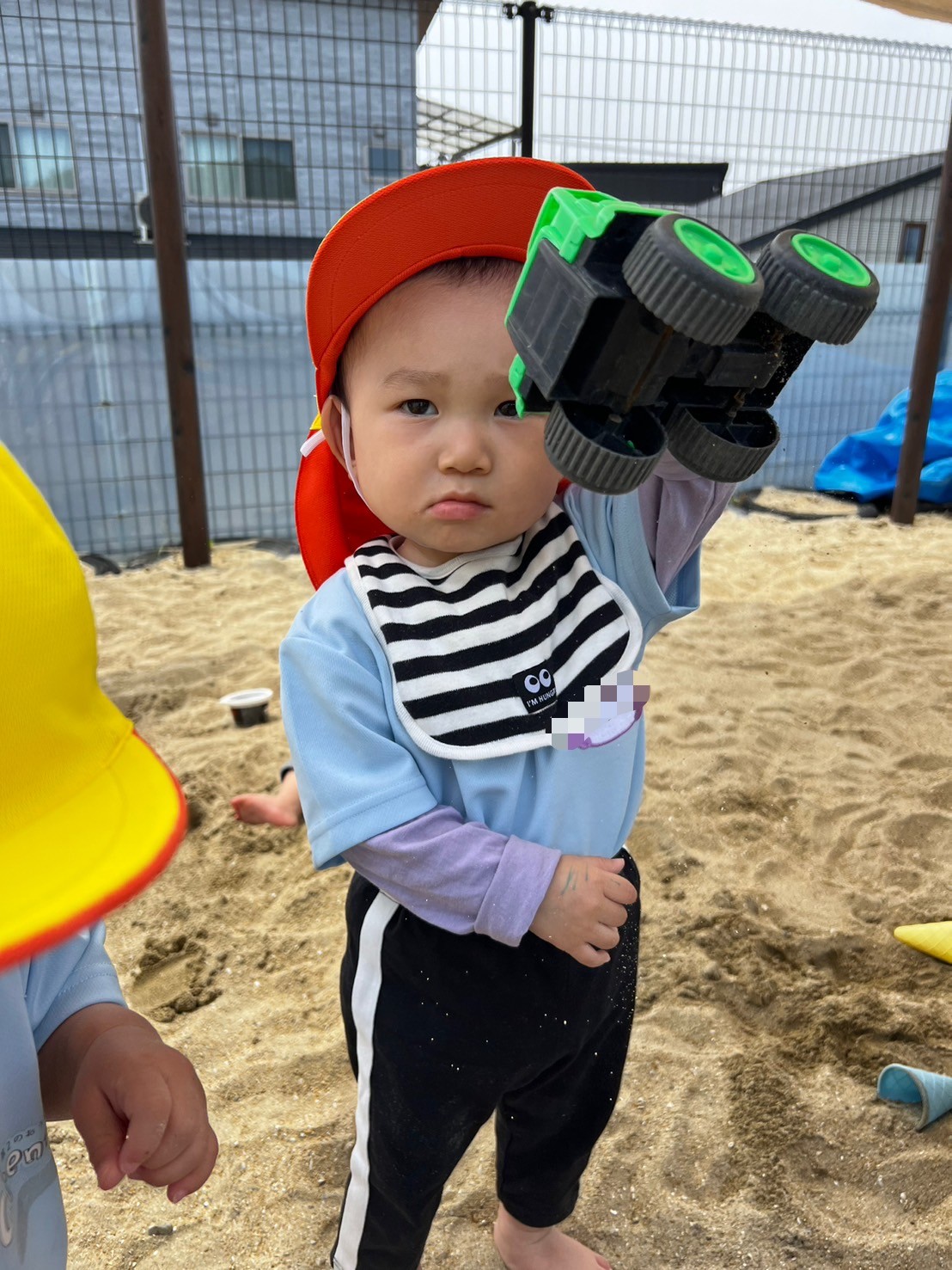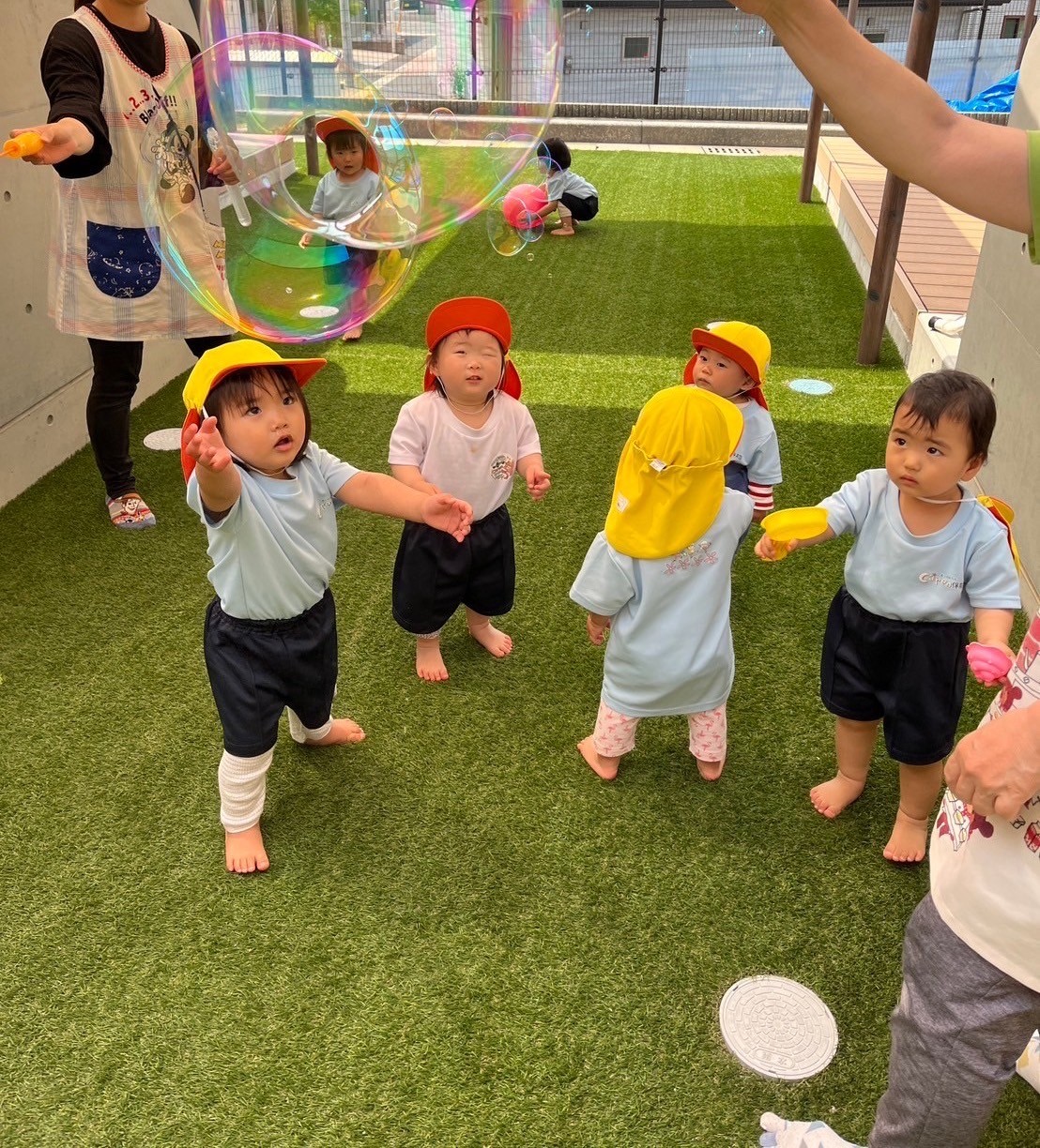 お部屋で体操をしたあとは園庭でシャボン玉とお砂遊びをしました🌟 大きなシャボン玉が上に上がっているのを見つけたり、小さなシャボン玉をぱちんと潰そうとしたりがんばって追いかけていました🥰 お砂場遊びも全身を使って楽しみましたよ🤭💕