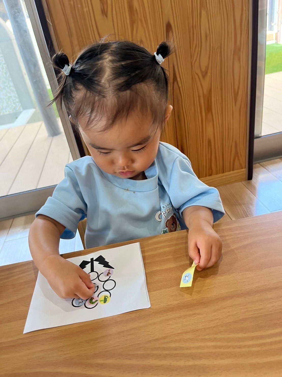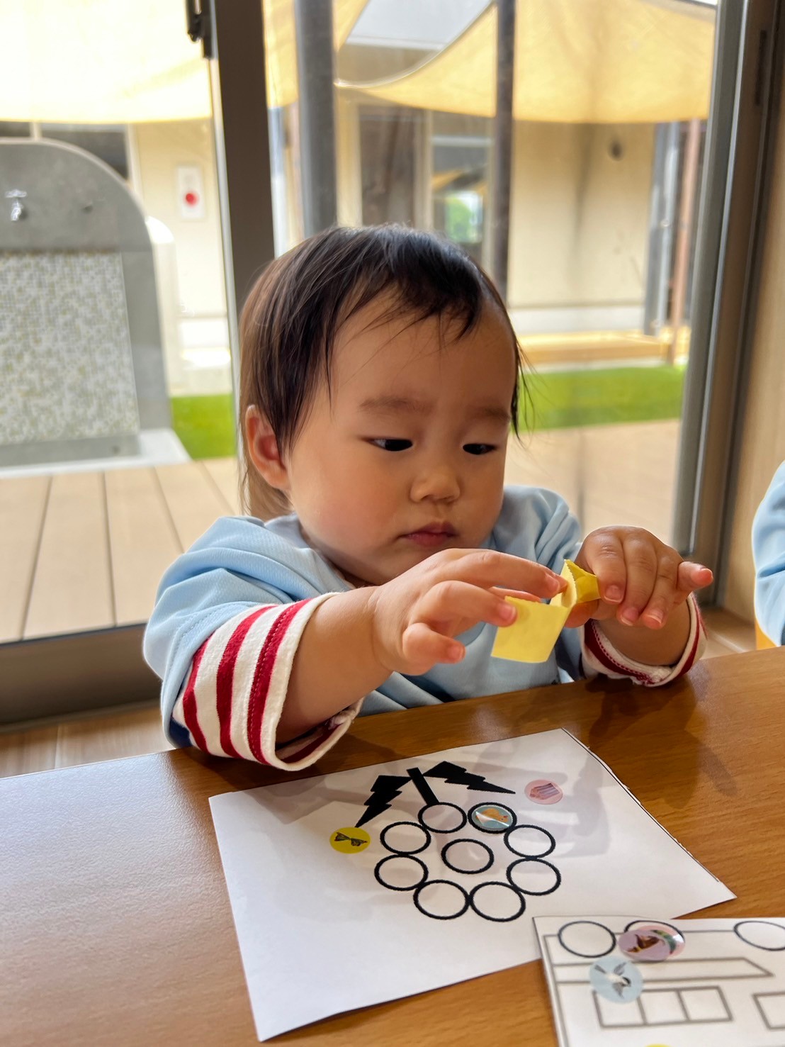 先生のお手本を見ながら丸の中にシールを貼る子や好きな場所に貼る子など指先を上手に使って活動しましたよ👏