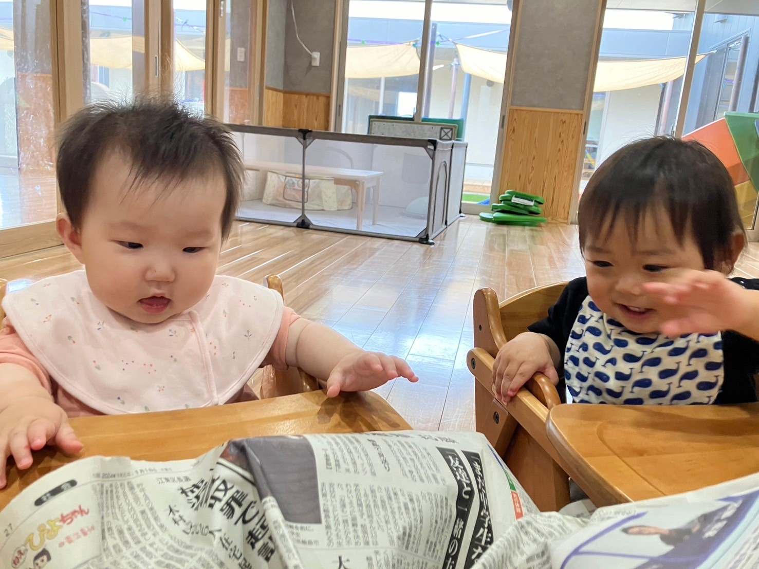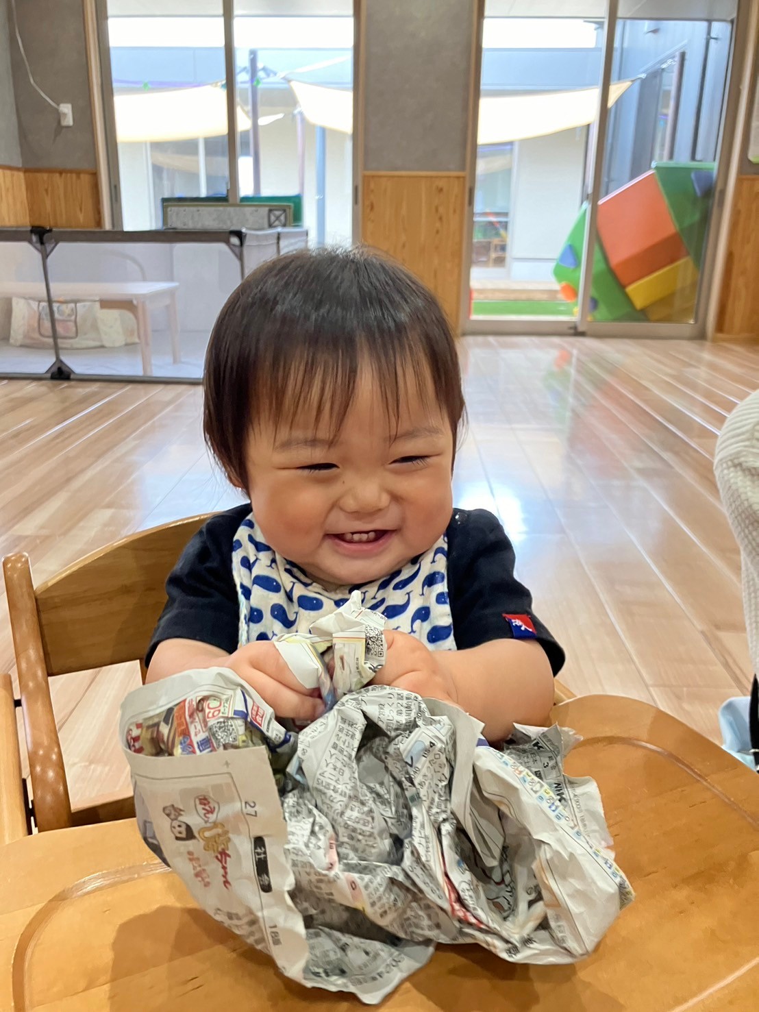 次に新聞紙遊び📰をしていき、新聞紙で『いないいないばぁ』をしていくとケラケラ🤣大笑いしてましたよ♡触って感触を感じたりカシャカシャならして音を楽しんだりしました🥰
